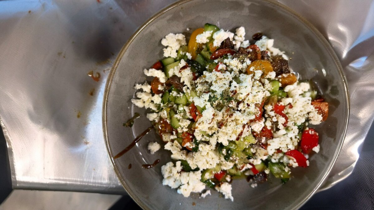 Κλασική ελληνική έμπνευση με φρέσκα λαχανικά, φέτα και τραγανό παξιμάδι χαρουπιού, με άρωμα θυμαριού και κρέμα βαλσάμικου.