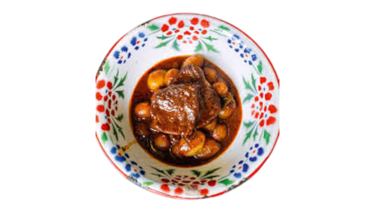 Τρυφερό μοσχαράκι κομμένο σε μικρά κομμάτια μαγειρεμένο σε σάλτσα ντομάτας.