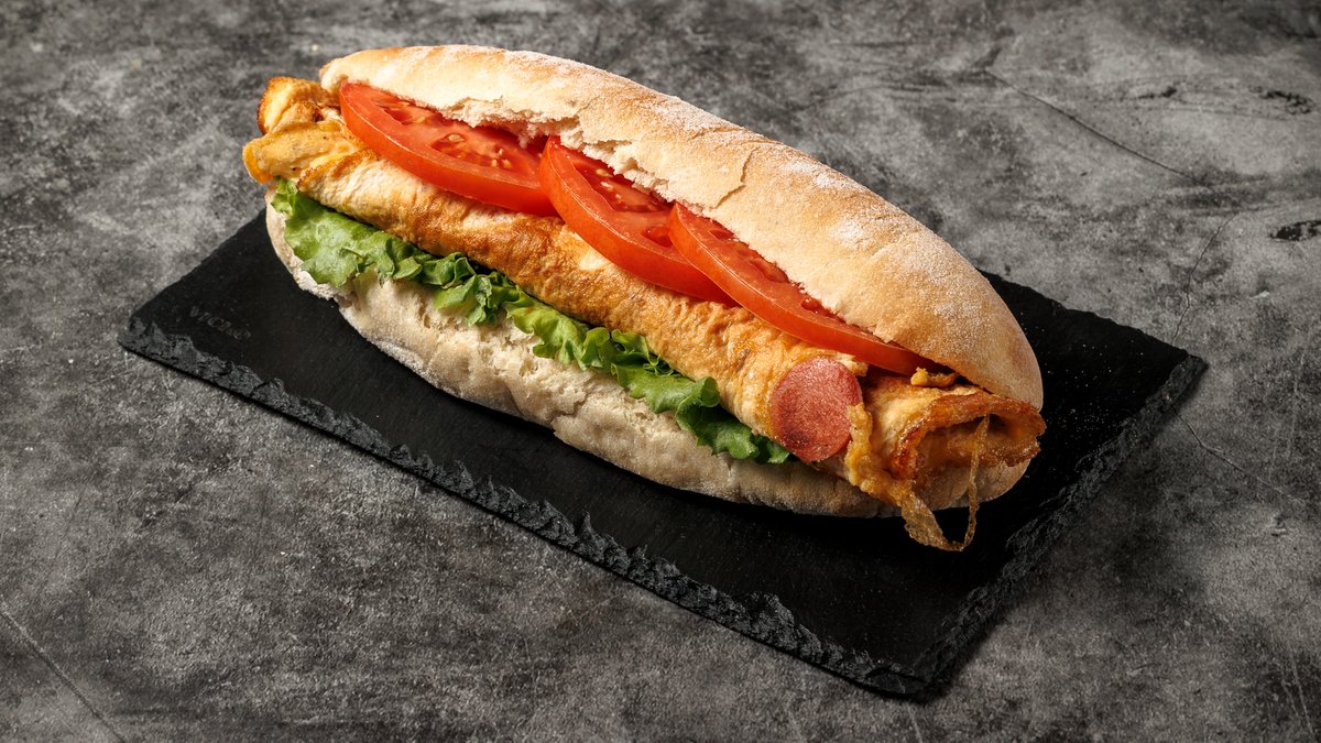 Μπαγκέτα με Σως Τυριού, Ομελέτα , Λουκάνικο, Μαρούλι και Ντομάτα