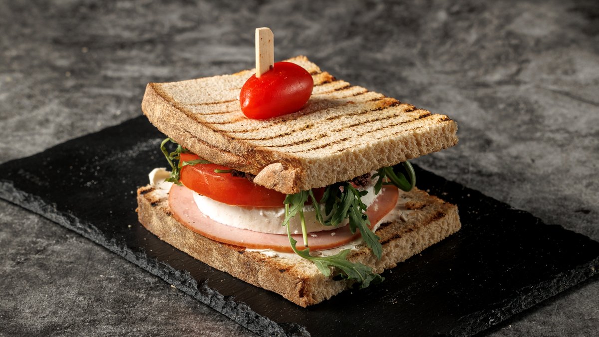 Φρυγανισμένο Ζυμωτό Ψωμί με Γαλοπούλα, Μανούρι, Σως Τυριού, Πάστα Ελιάς, Ρόκα Ντομάτα