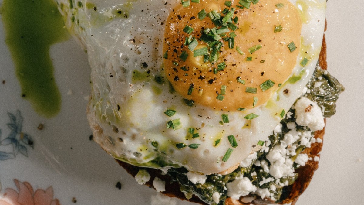 Φρυγανισμένο προζυμένιο ψωμί με γέμιση σπανακόπιτας, τριμμένη φέτα, κουκουνάρι και αυγό τηγανιτό