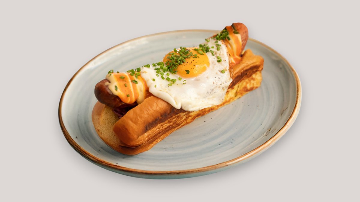 Ψωμάκι brioche, coleslaw σαλάτα, βιολογικό ψητό λουκάνικο, ketchup πιπεριάς Φλωρίνης, cheddar sauce, τηγανητό αυγό