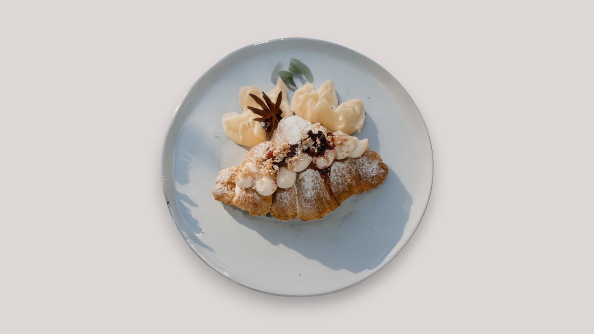 Κρουασάν βουτύρου με frosting γιαουρτιού, κόκκινα φρούτα, crumble βουτύρου, σιρόπι αγαύης και ζάχαρη άχνη