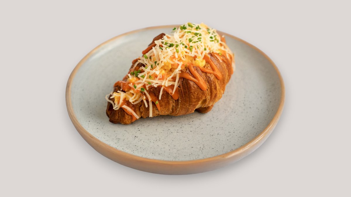 Croissant βουτύρου, με scrambled eggs, κεφαλοτύρι και ketchup πιπεριάς Φλωρίνης