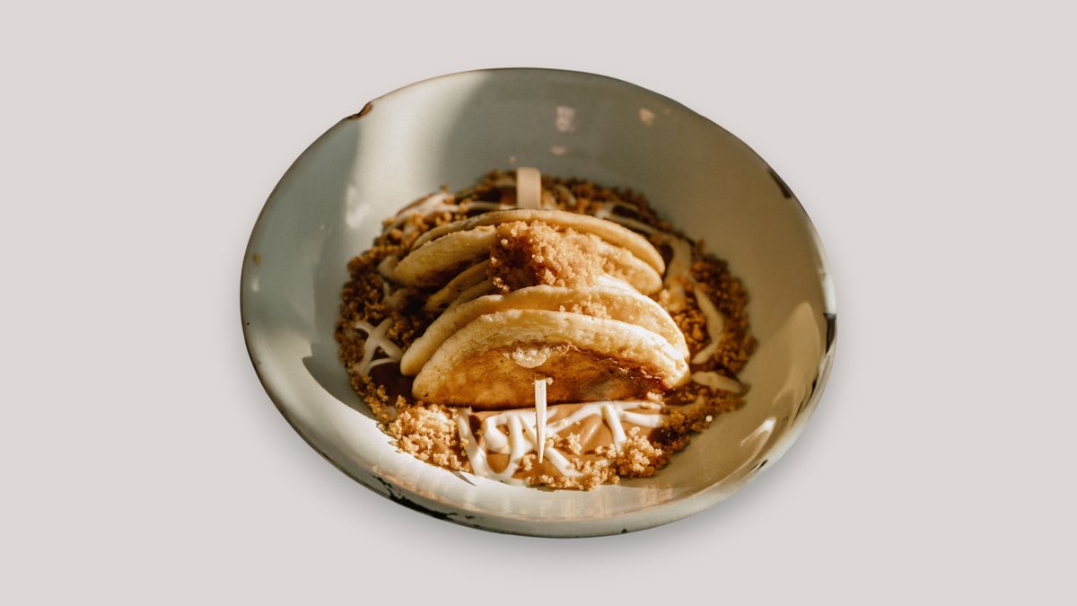 Χειροποίητα pancakes , πραλίνα Lotus , πραλίνα λευκής σοκολάτας , crumble βουτύρου