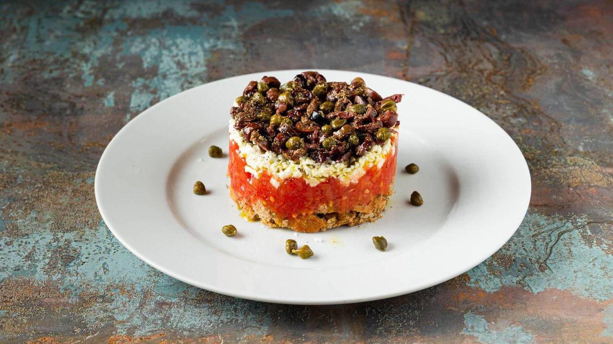 Σαλάτα με κριθαρένιο παξιμάδι, ντομάτα, φέτα, ελιά και κάππαρη