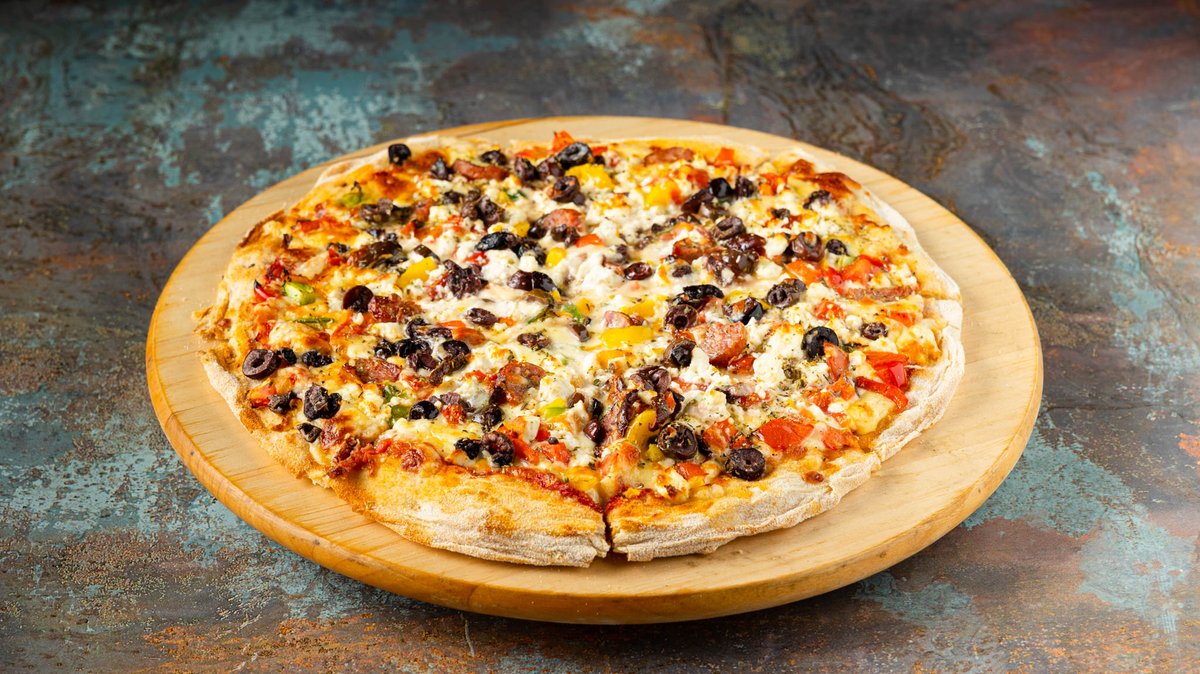 Ιταλική ζύμη. Με σάλτσα ντομάτας, gouda, πιπεριά πράσινη, ζαμπόν, μπέικον, μανιτάρια και λουκάνικο χωριάτικο