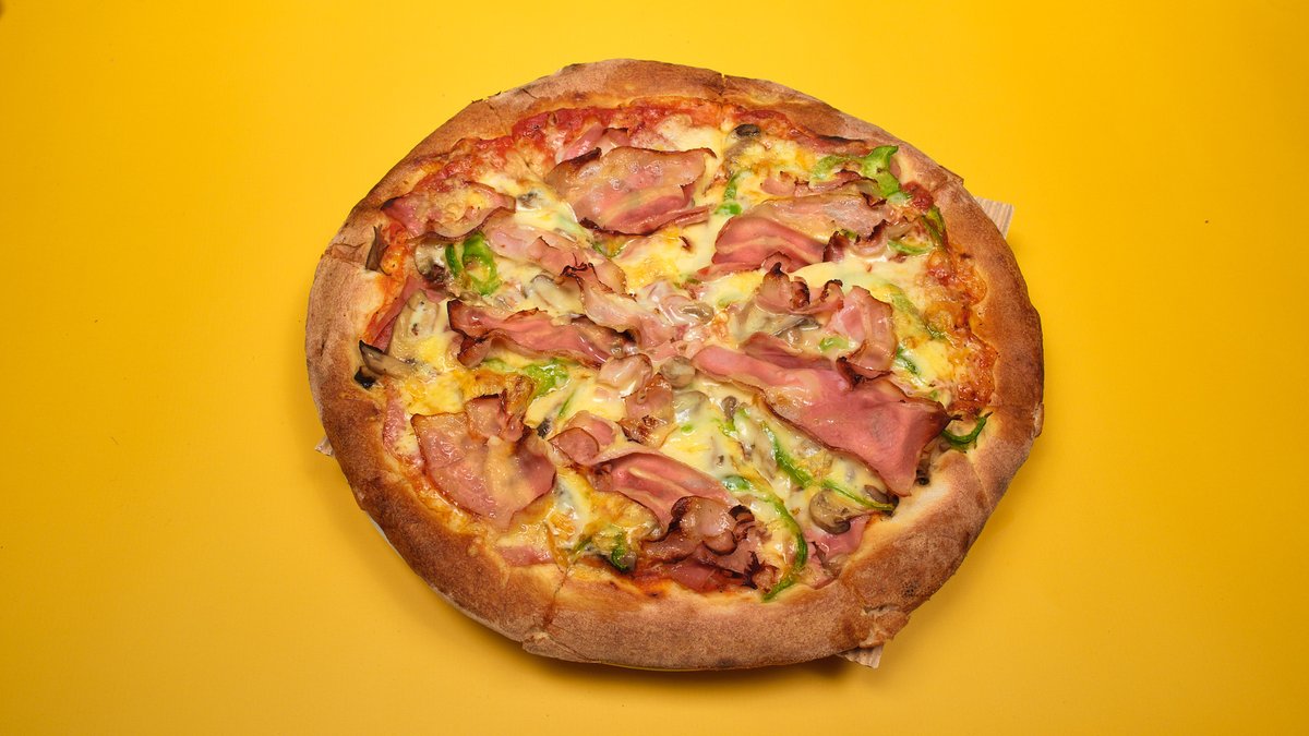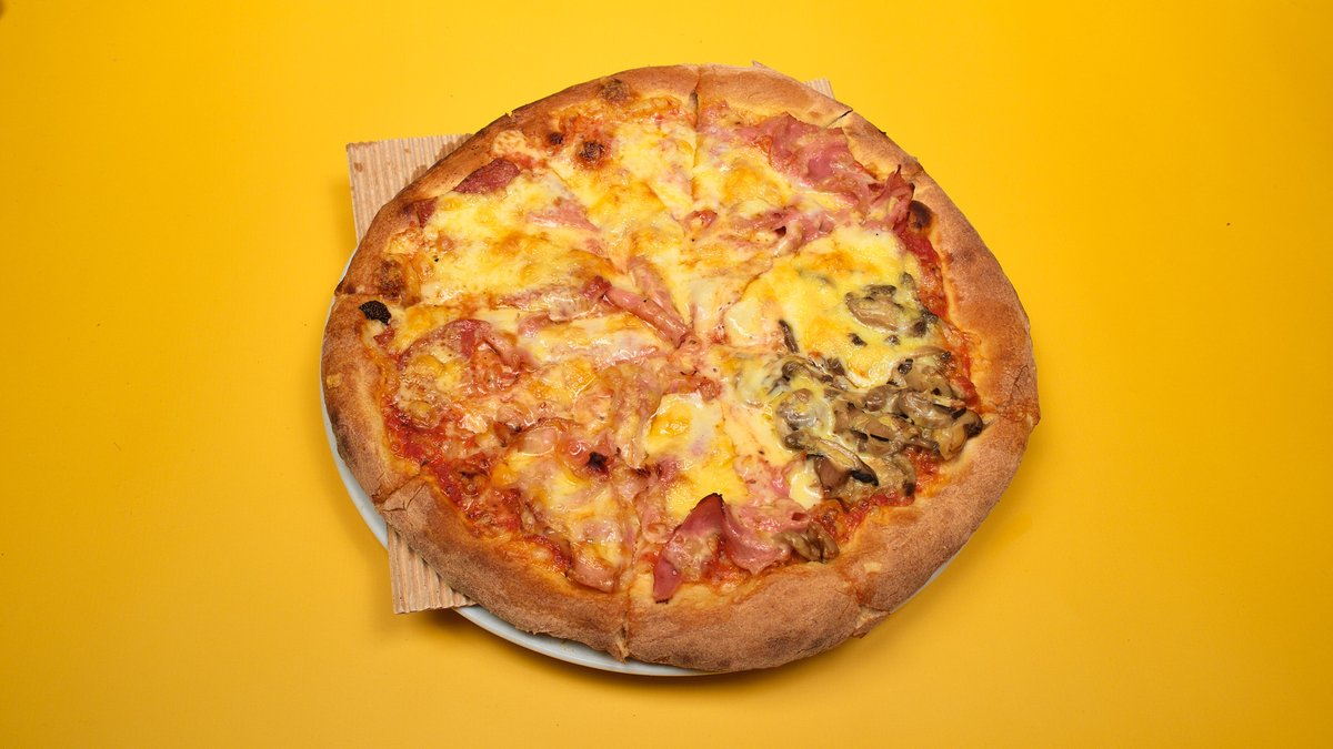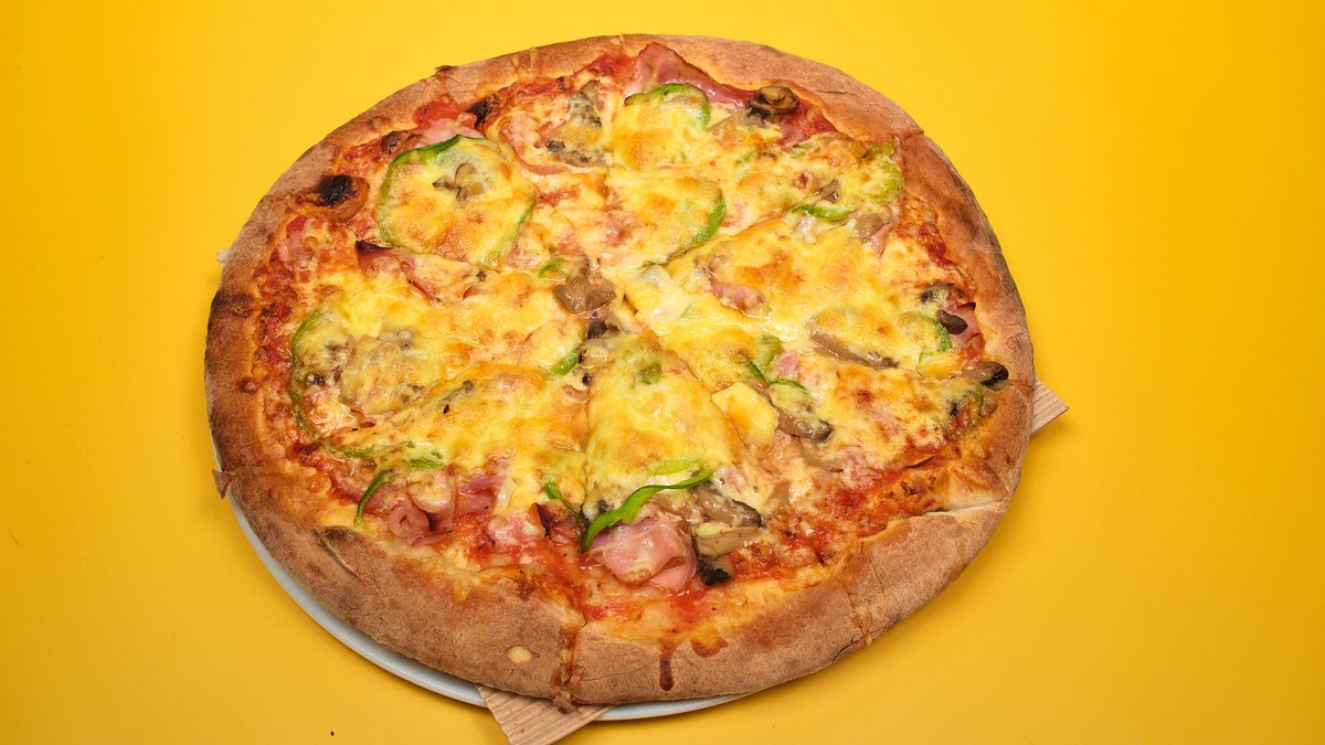 Με σάλτσα ντομάτας, ζαμπόν, τυρί, μανιτάρια και πιπεριά
