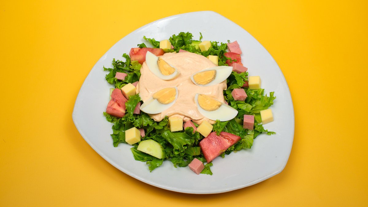 Σαλάτα με μαρούλι, ντομάτα, αγγούρι, αυγό, τυρί, ζαμπόν και sauce