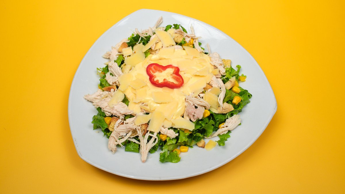 Σαλάτα με κοτόπουλο, μαρούλι, κρουτόν, καλαμπόκι, vinaigette sauce και παρμεζάνα