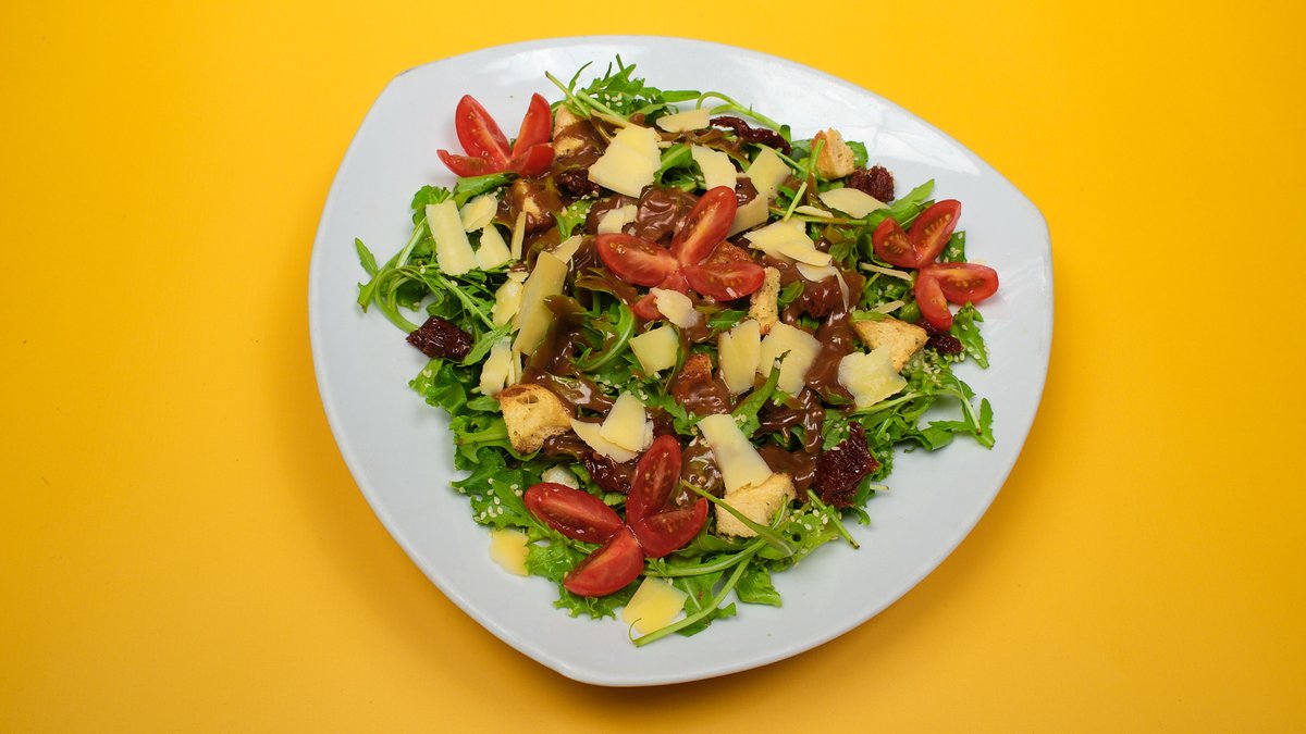 Σαλάτα με μαρούλι, ντοματίνια, λιαστή ντομάτα, κρουτόν, παρμεζάνα, σουσάμι και vinaigette sauce