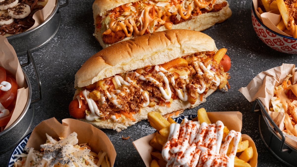 Αφράτο ψωμάκι, ψητό Λουκάνικο 120 g της επιλογής σου, φρέσκο λάχανο, καρότο, τραγανό κρεμμύδι, πατάτες crispers mccain, ketchup, μουστάρδα, και μαγιονέζα