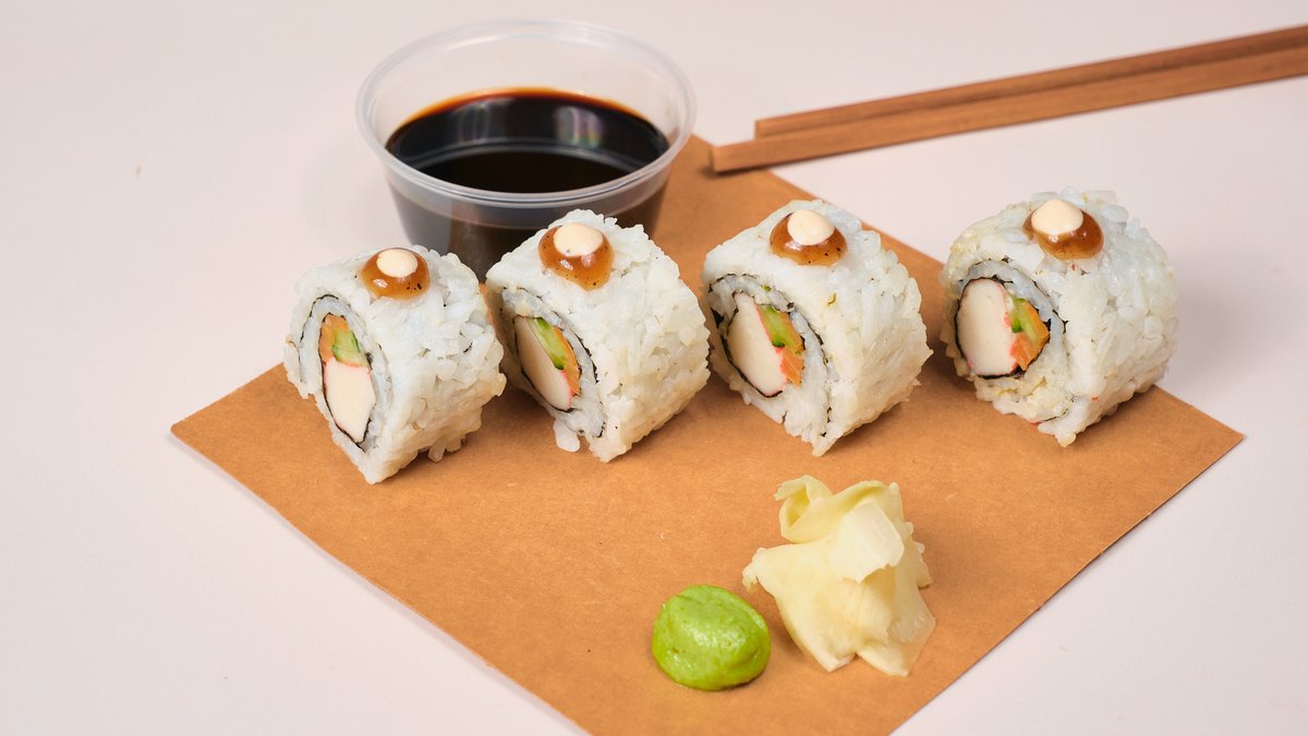 Με σολομό, σουρίμι, αγγούρι, spicy mayo, teriyaki glaze και τηγανητό κρεμμύδι