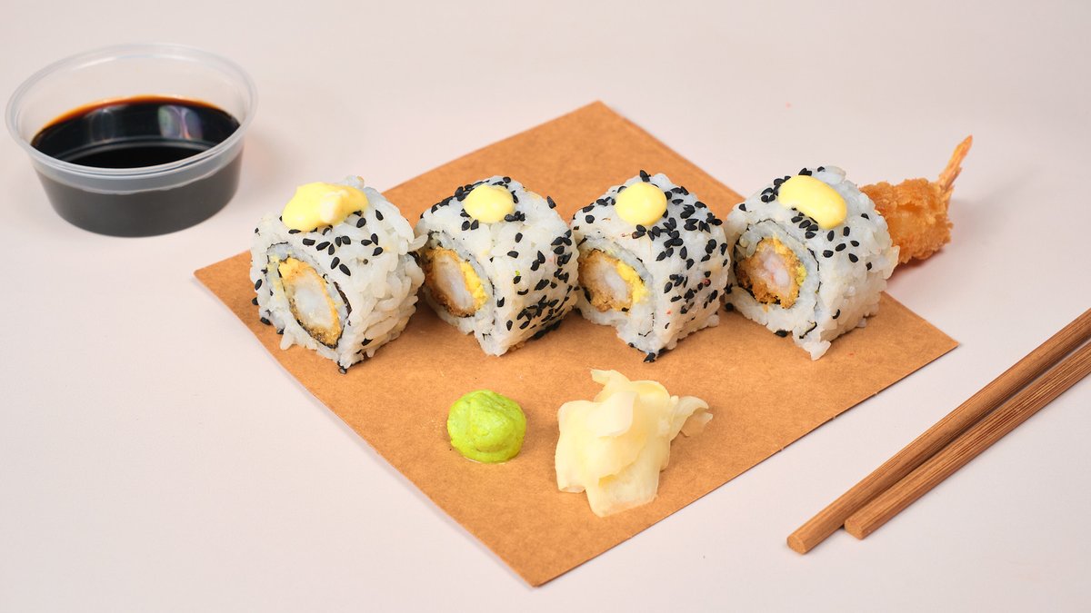 Με βραστή γαρίδα, τυρί κρέμα, sweet chilli, spicy mayo