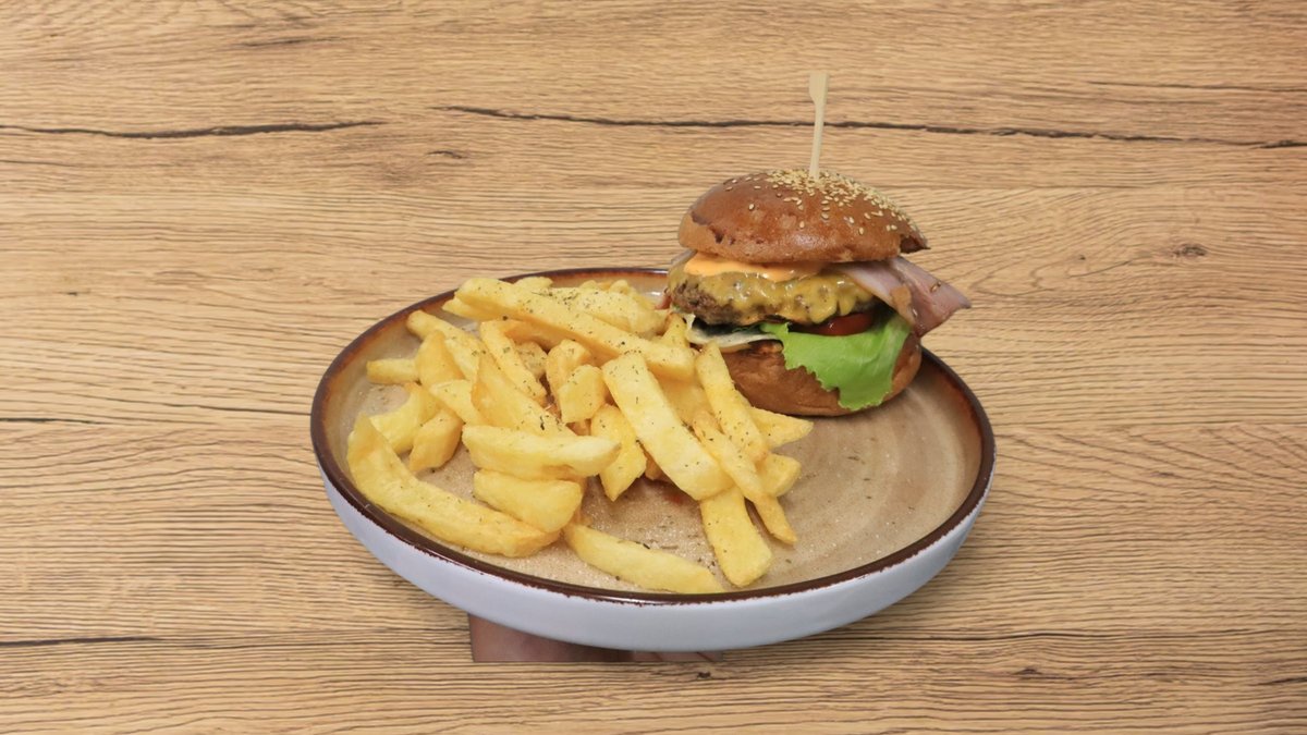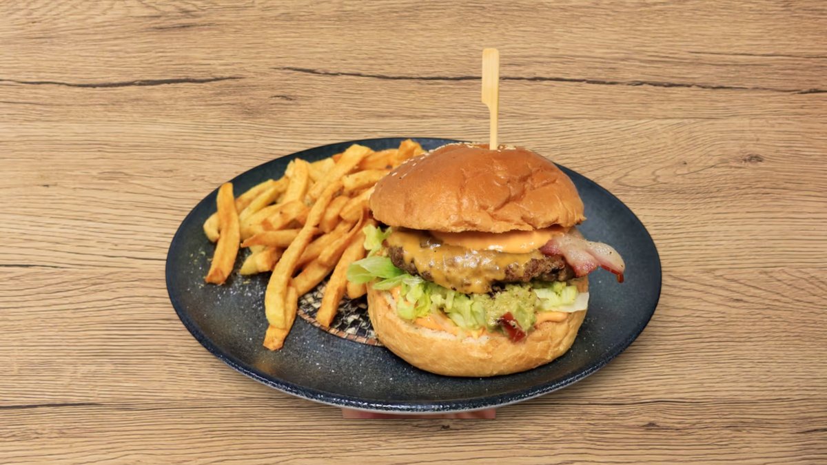 Με 100% μοσχαρίσιο bully smash burger 175gr, μπέικον, cheddar, φρέσκο κρεμμύδι, iceberg, ντομάτα, BBQ sauce και sauce cocktail.Συνοδεύεται από πατάτες τηγανιτές