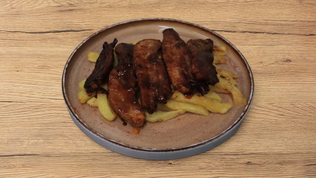 Συνοδεύεται από πατάτες τηγανητές, σως μουστάρδας χειροποίητη και πίτες