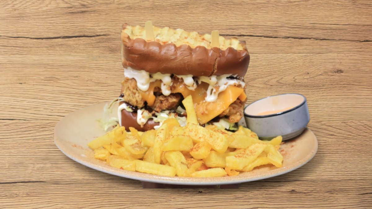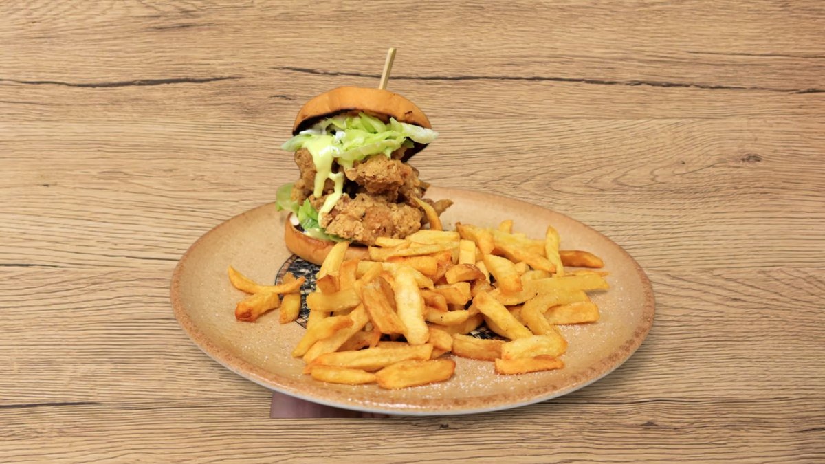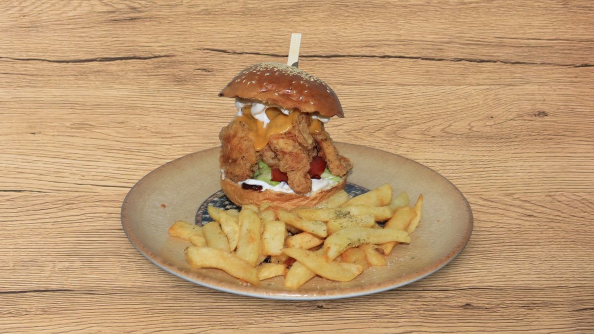 Με brioche roll με χειροποίητο τηγανιτό φιλέτο κοτόπουλο, διπλό cheddar, crispy onion, shred iceberg, aioli και bbq sauce. Συνοδεύεται από πατάτες τηγανιτές