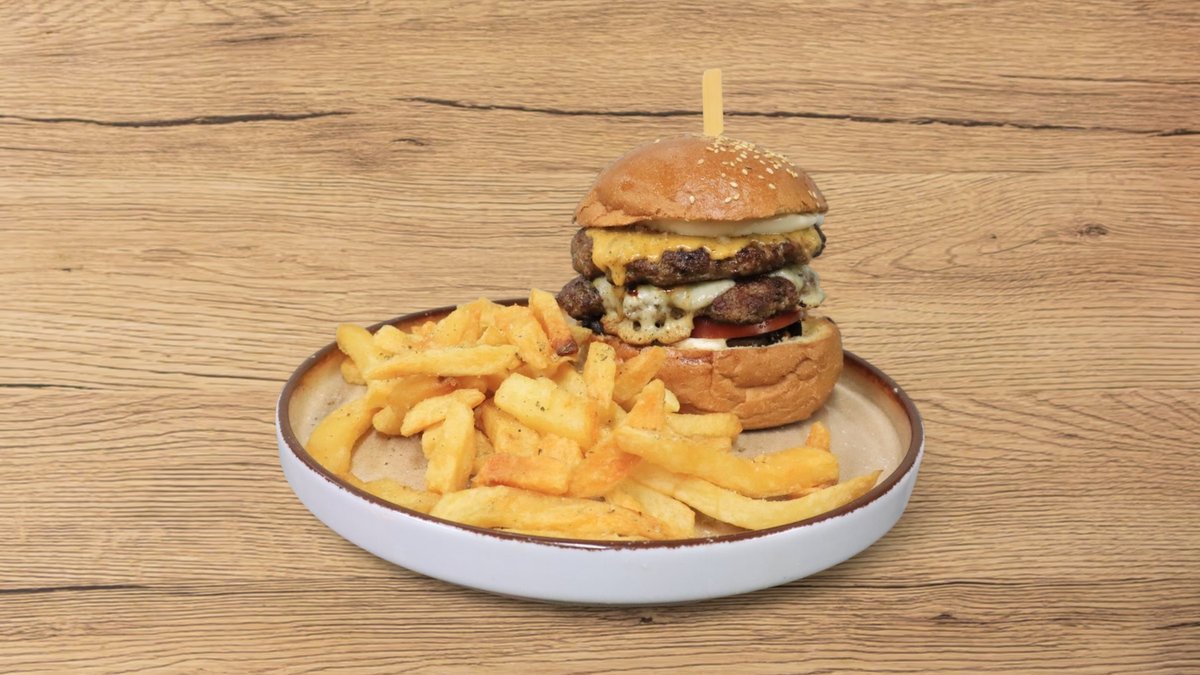 Με 2 bully smash burger 175gr, cheddar, γραβιέρα, χειροποίητα καραμελωμένα κρεμμύδια, χειροποίητα, καραμελωμένα μανιτάρια, παρμεζάνα ντομάτα, aioli sauce και BBQ sauce. Συνοδεύεται από πατάτες τηγανιτές
