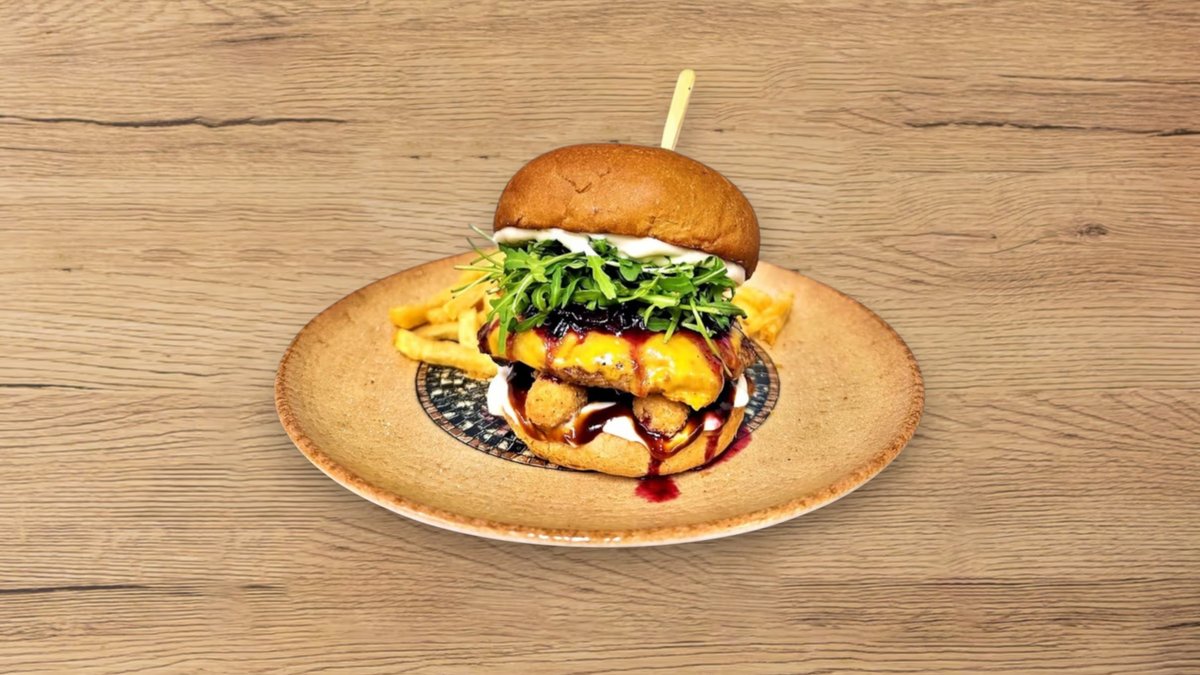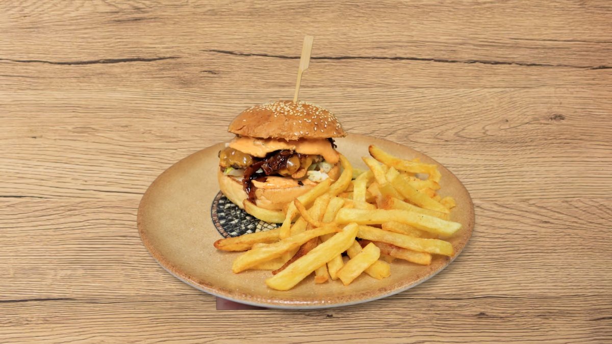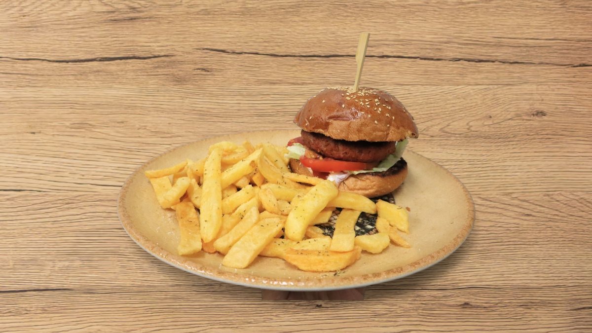 Με αφράτο ψωμάκι burger με vegan plant based μπιφτέκι, μαγιονέζα vegan, iceberg, ντομάτα, πίκλες χειροποίητες και ketchup. Συνοδεύεται από πατάτες τηγανητές