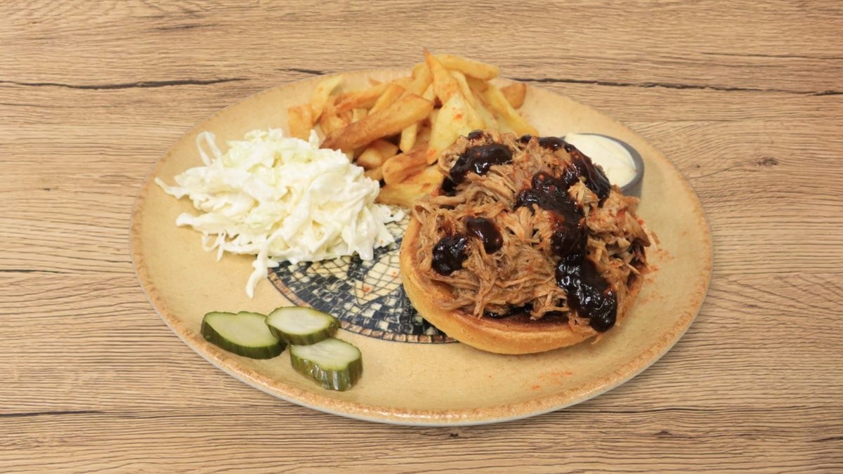 Σιγοκαπνισμένο pulled pork πάνω σε φρυγανισμένο ψωμάκι. Συνοδέυεται από πατάτες τηγανιτές και σαλάτα coleslaw.