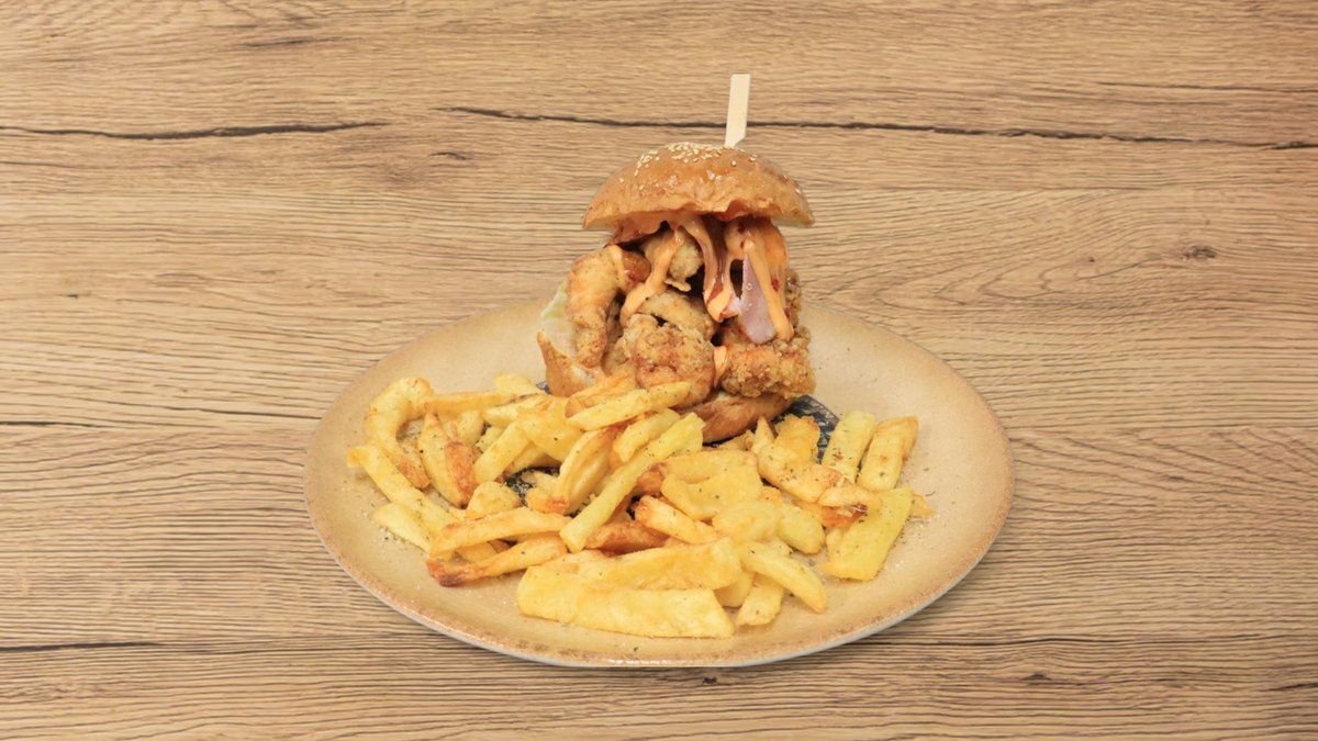 Μετηγανητό φιλέτο κοτόπουλο σε πατατόψωμο, μπέικον, iceberg, cocktail sauce και sweet chili sauce. Συνοδεύεται από πατάτες τηγανιτές