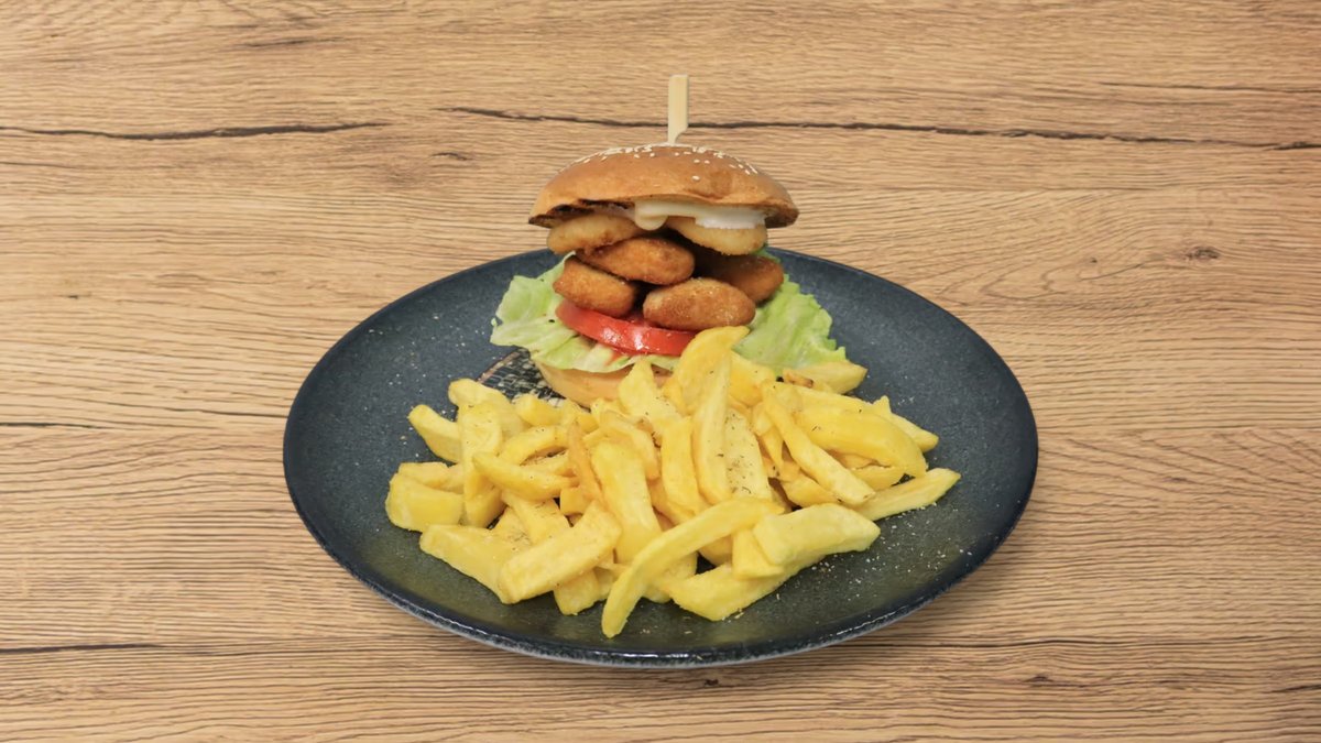Αφράτο ψωμάκι με chicken free nuggets, ντομάτα, iceberg, onion rings, μαγιονέζα vegan και μουστάρδα. Συνοδεύεται από πατάτες τηγανητές