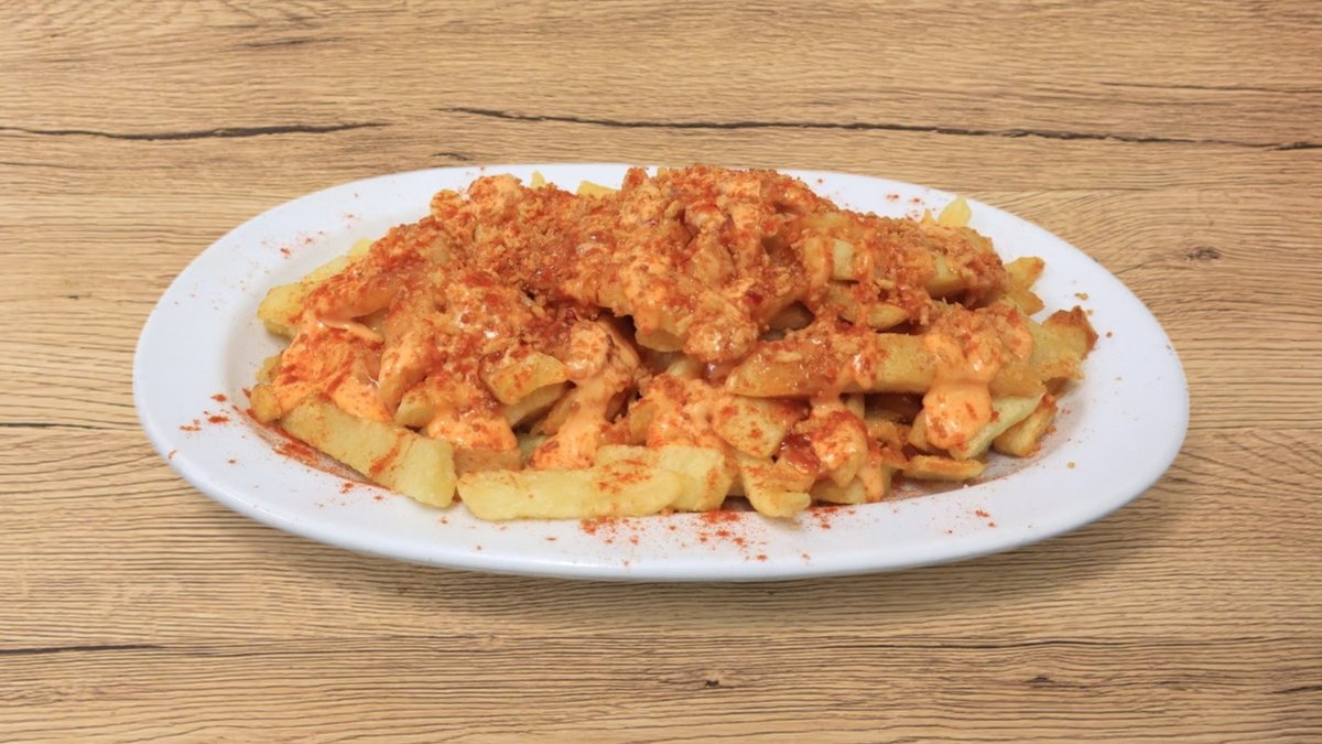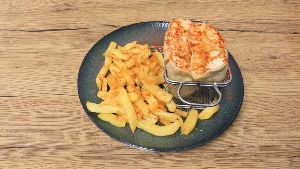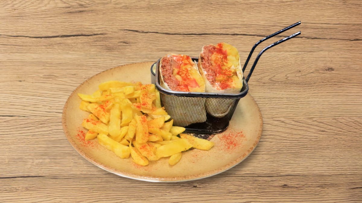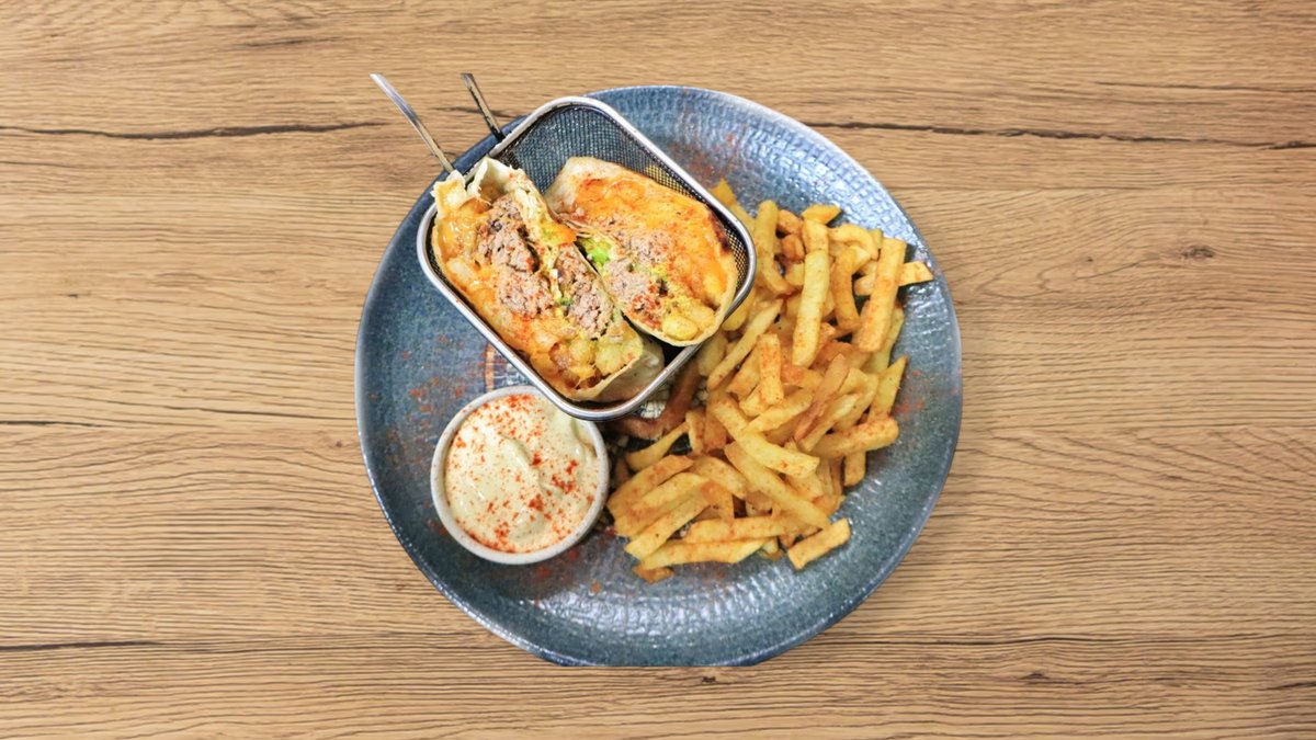 Με plant based κιμά, πατάτες, ντομάτα, vegan mayo και sweet chili. Συνοδεύεται από πατάτες τηγανητές