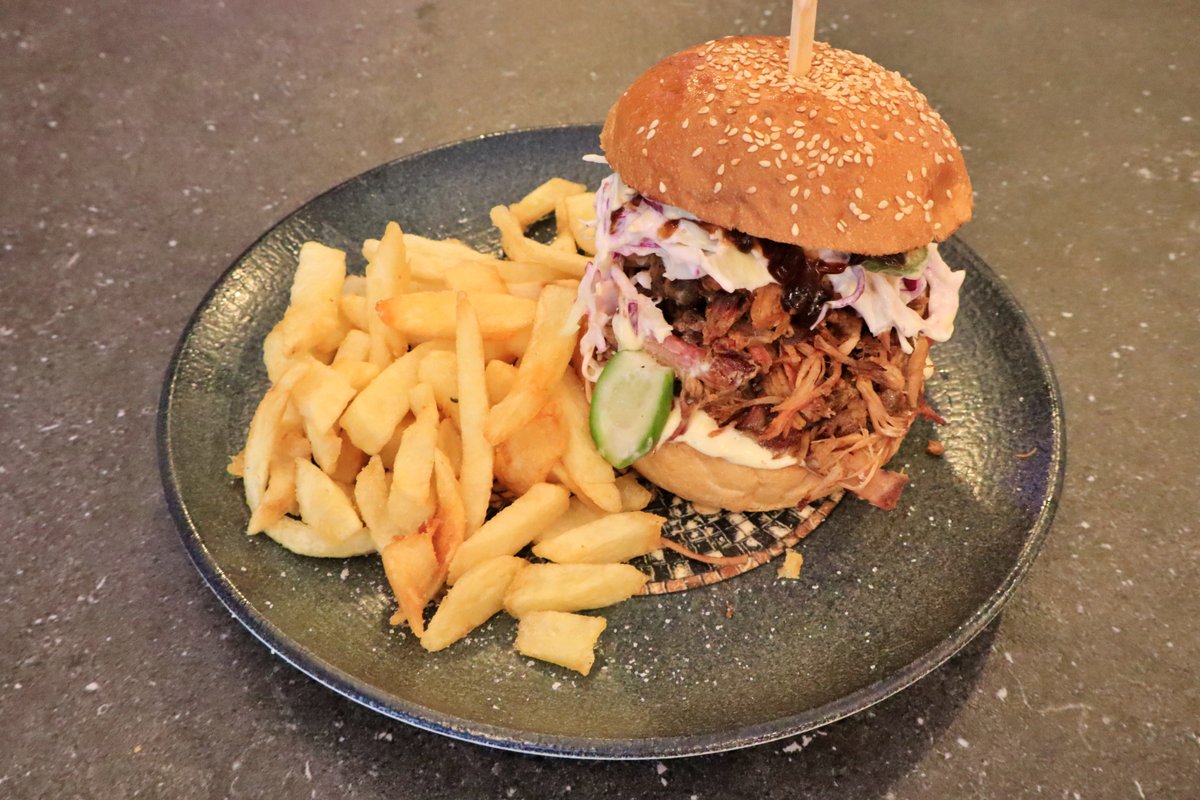 Mε χειροποίητο ψωμάκι brioche, χοιρινό pulled pork, sauce μουστάρδας, coleslaw, BBQ και χειροποίητες πίκλες. Συνοδεύεται από πατάτες τηγανιτές