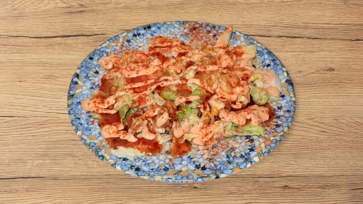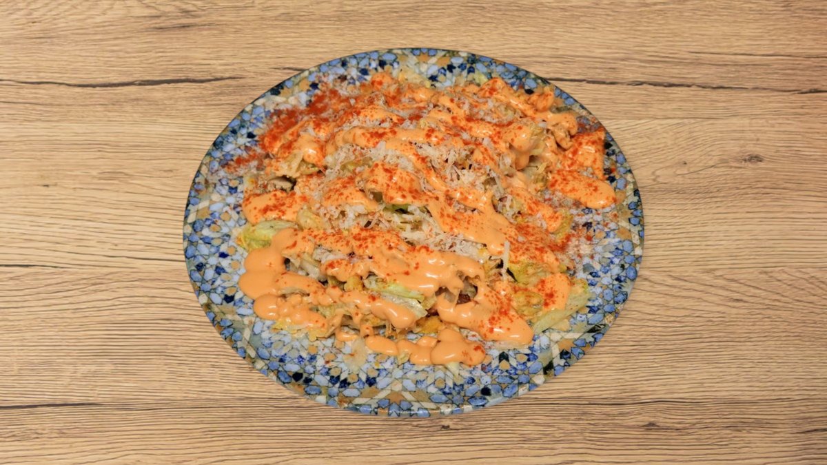 Σαλάτα με iceberg, τηγανητό φιλέτο κοτόπουλου, μπέικον, sweet chilli sauce, cocktail sauce και καπνιστή γλυκιά πάπρικα