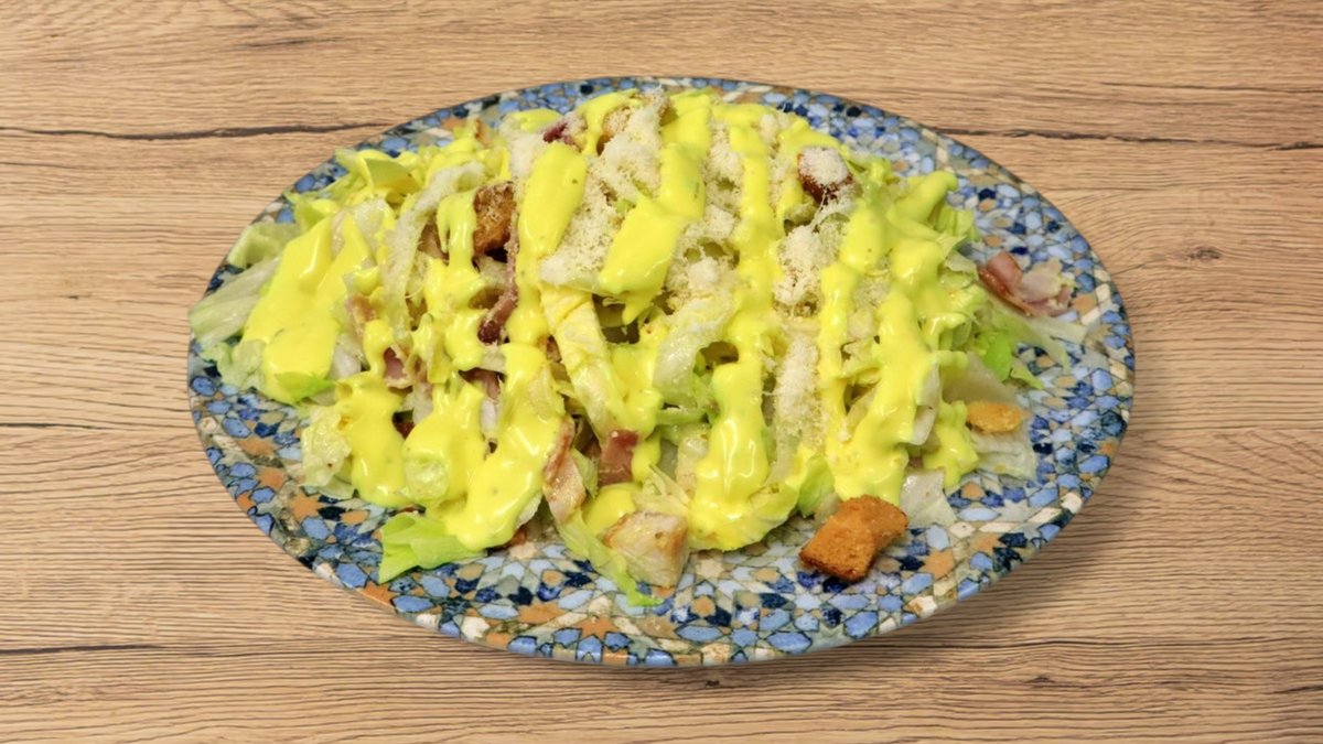 Σαλάτα με iceberg, φιλέτο κοτόπουλο, μπέικον, παρμεζάνα, χειροποίητο κρουτόν και sauce Caesar`s