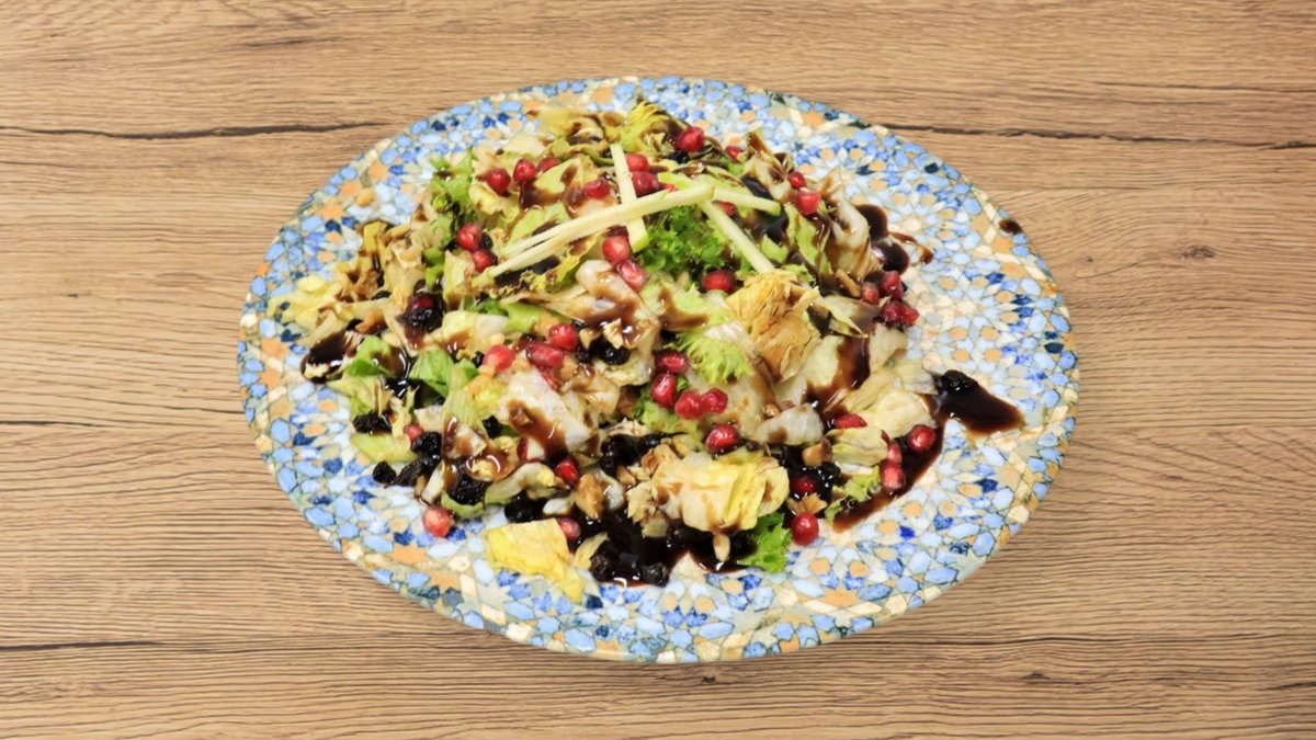 Σαλάτα με iceberg, λόλα, κουκουνάρι, καρύδι, ρόδι, σταφίδες, μήλο και βινεγκρέτ μελιού