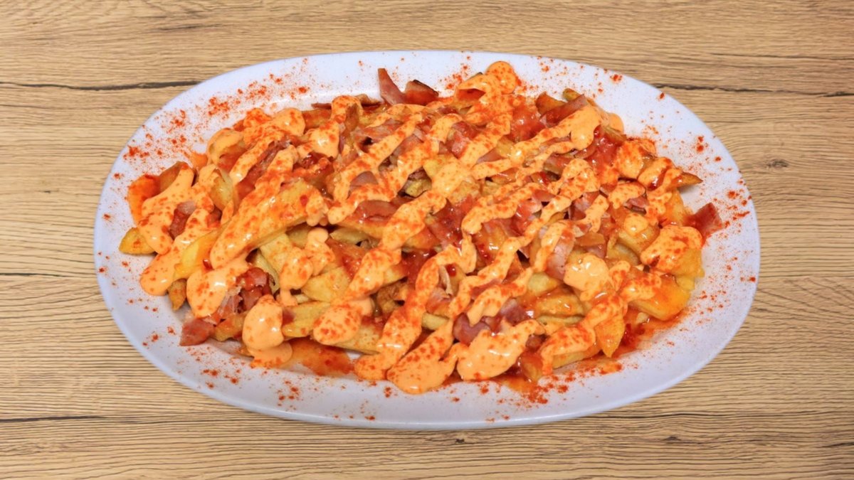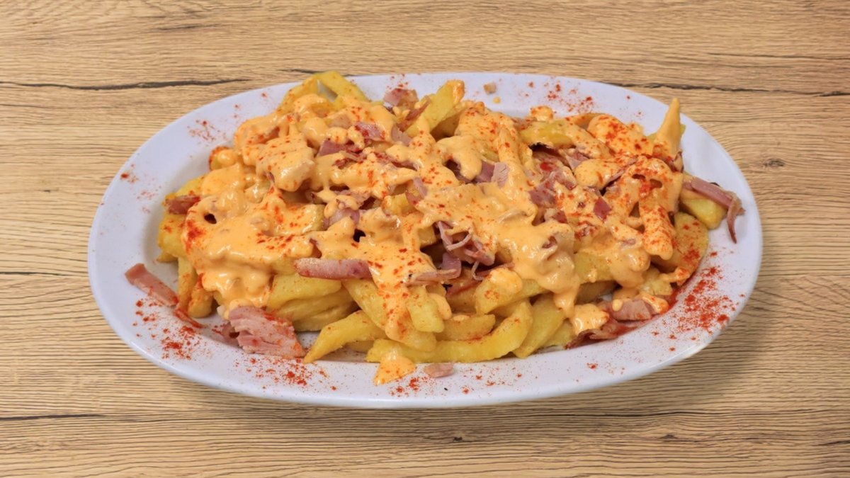 Φρέσκες τηγανητές πατάτες με χειροποίητο λιωμένο τσένταρ και ψιλοκομμένο μπέικον.