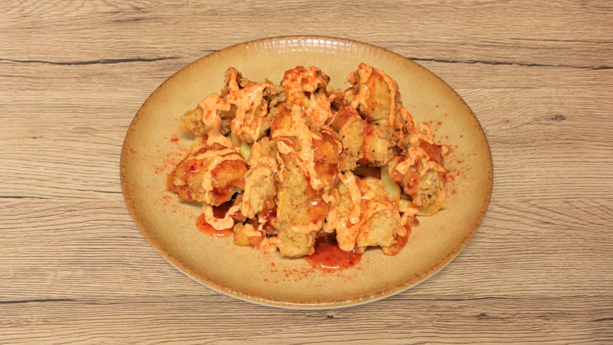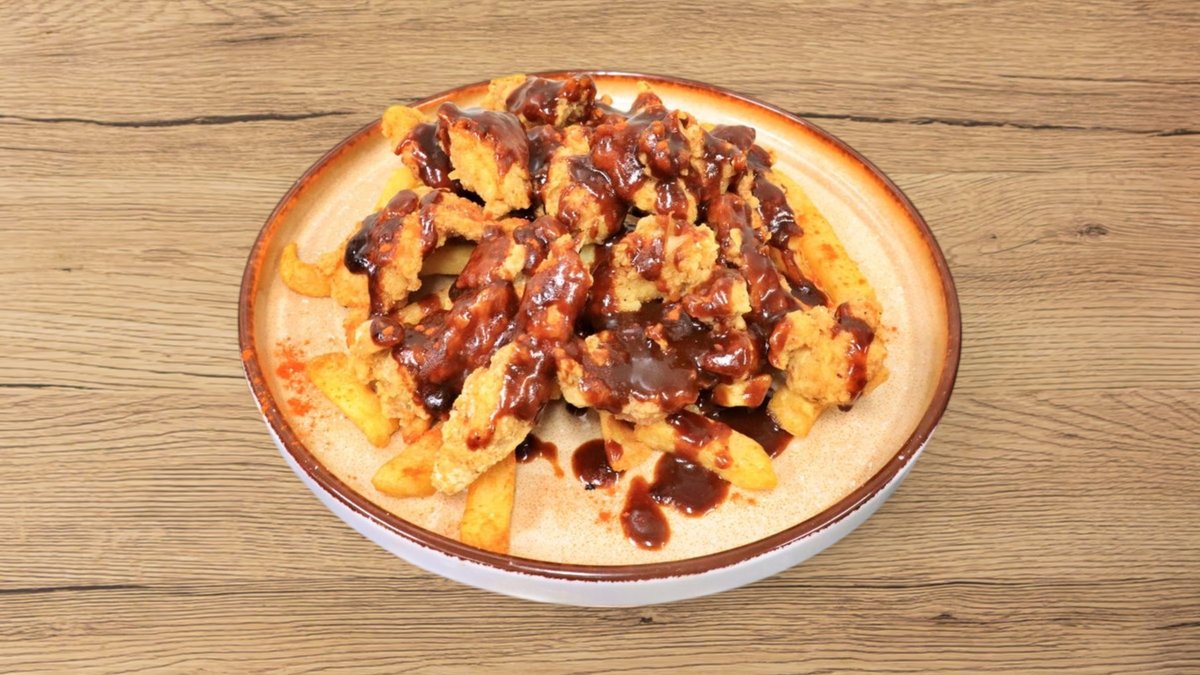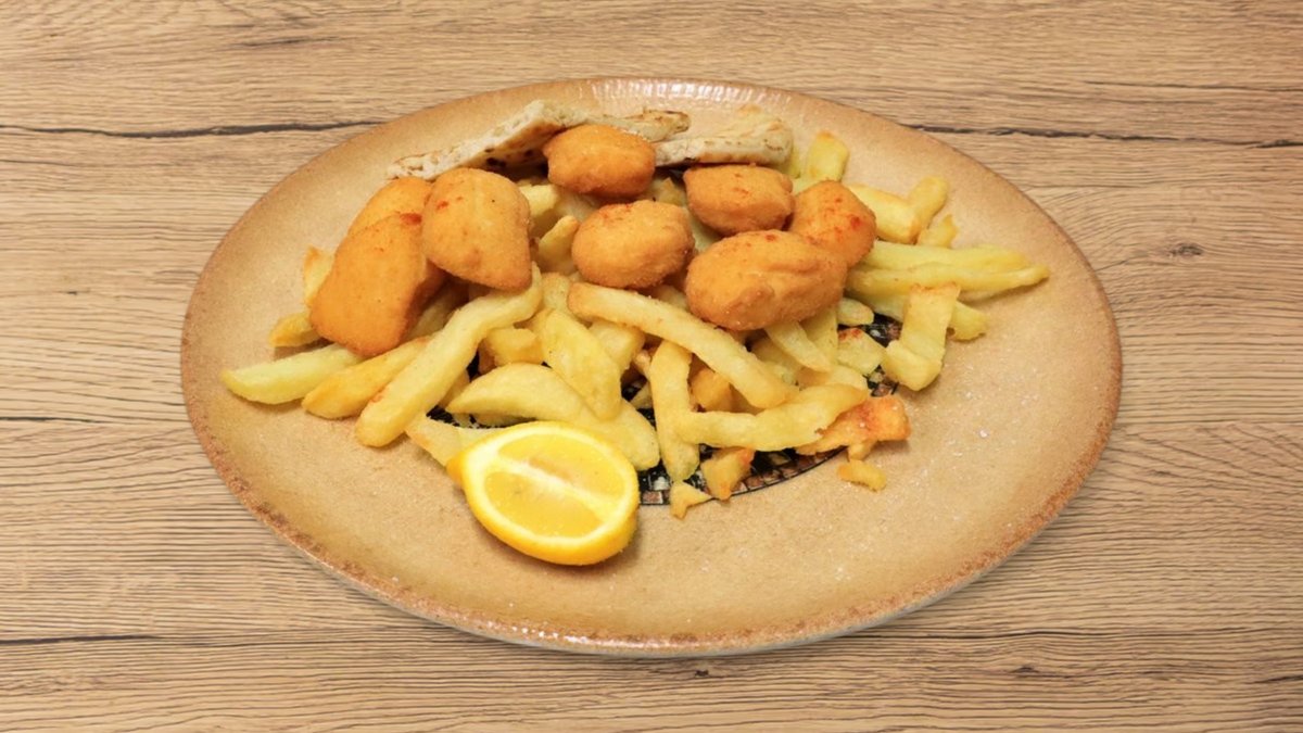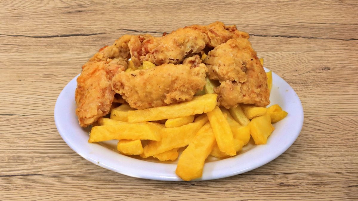Με χειροποίητο τηγανητό φιλέτο κοτόπουλο, sweet chili και cocktail sauce. Συνοδεύεται από πατάτες τηγανητές