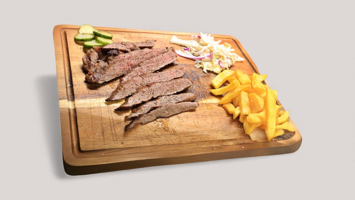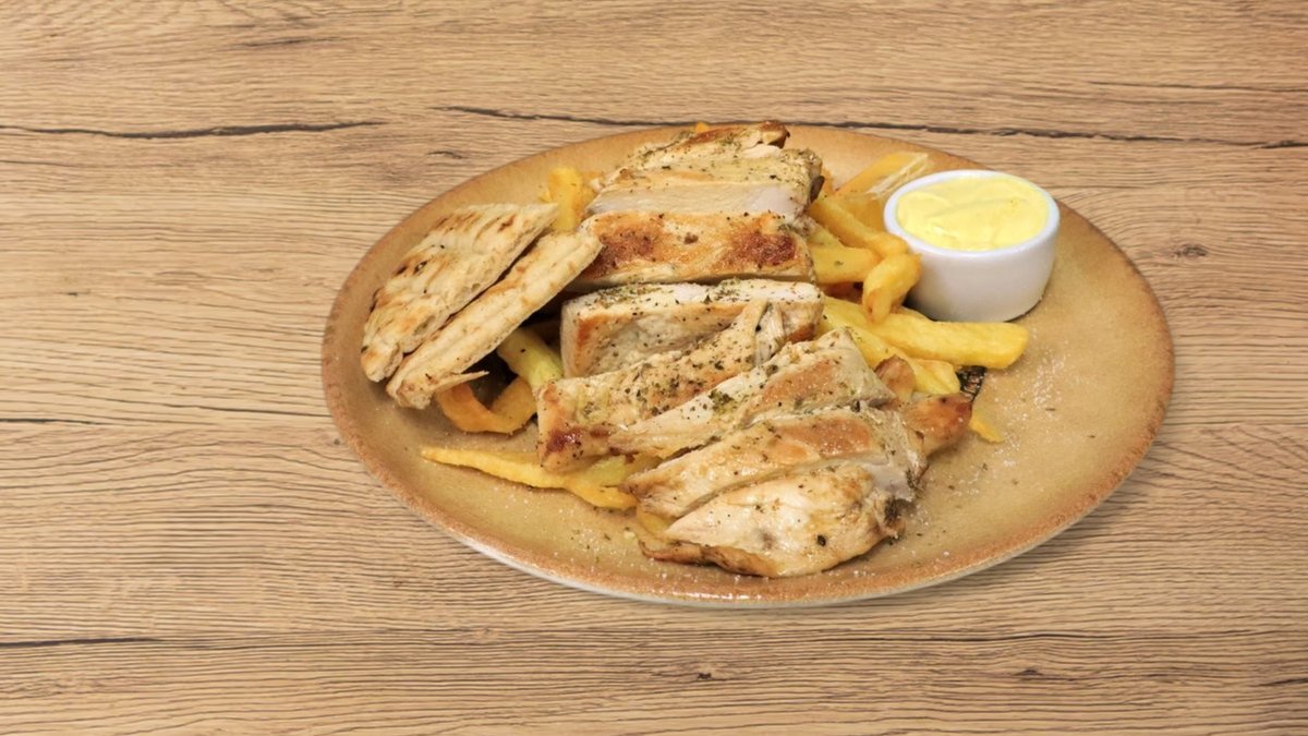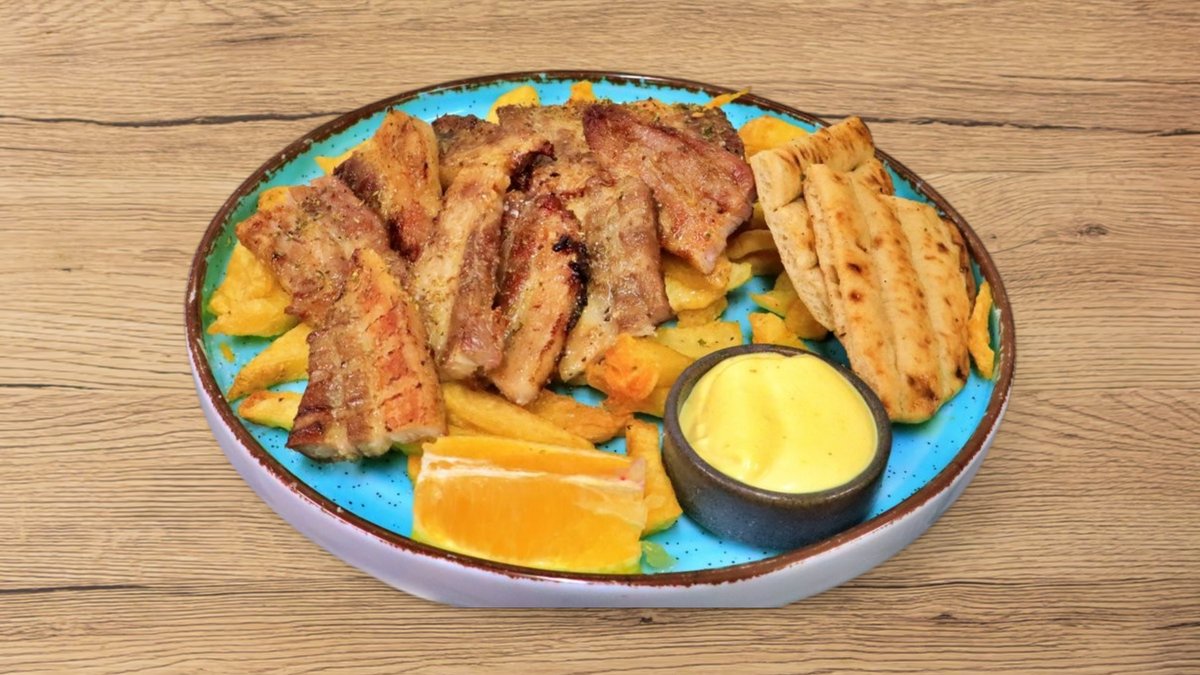 Συνοδεύεται από πατάτες τηγανητές, σως μουστάρδας χειροποίητη και πιτες.