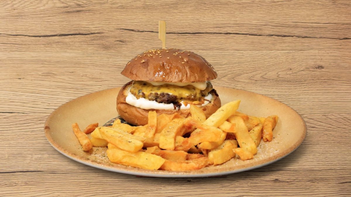 Με 100% μοσχαρίσιο bully smash burger 175gr, cheddar, χειροποίητα καραμελωμένα κρεμμύδια, μουστάρδα και μαγιονέζα. Συνοδεύεται από πατάτες τηγανιτές