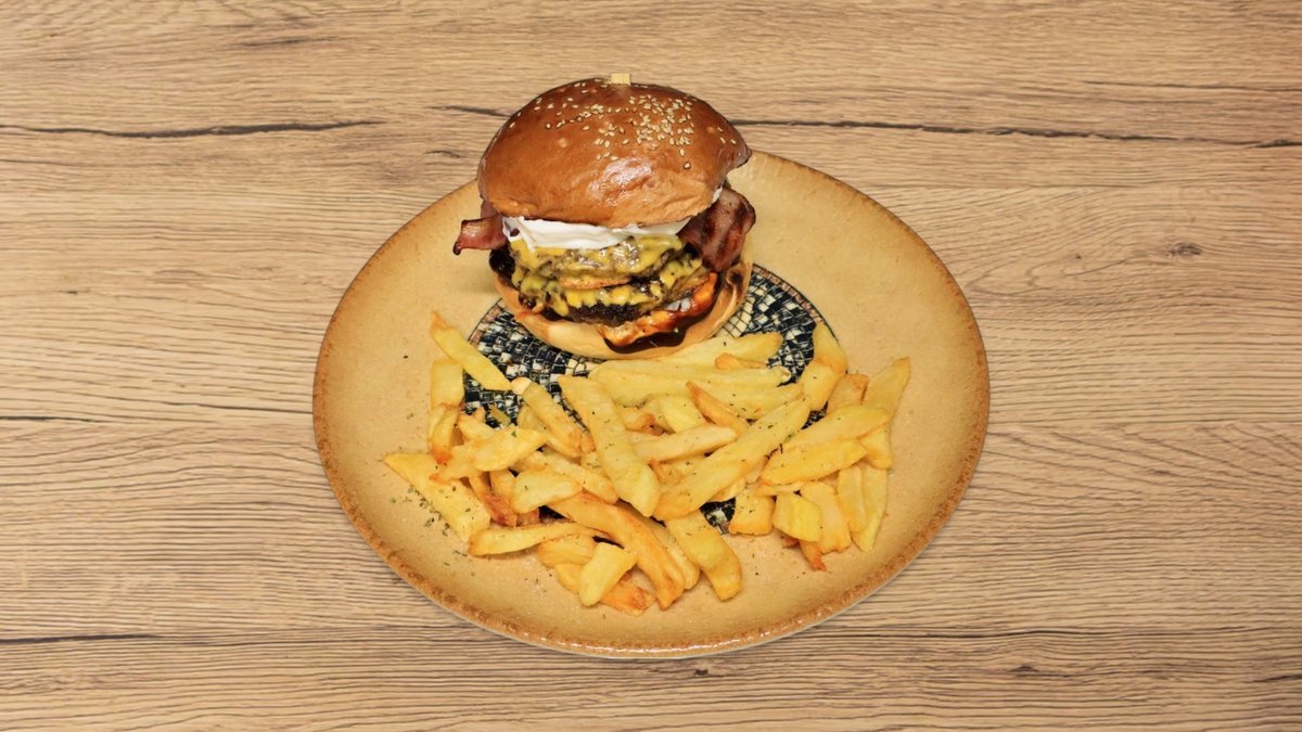 Με 2 bully smash burger 175gr, διπλό cheddar, μπέικον, ντομάτα, iceberg, μαγιονέζα και BBQ sauce. Συνοδεύεται από πατάτες τηγανιτές