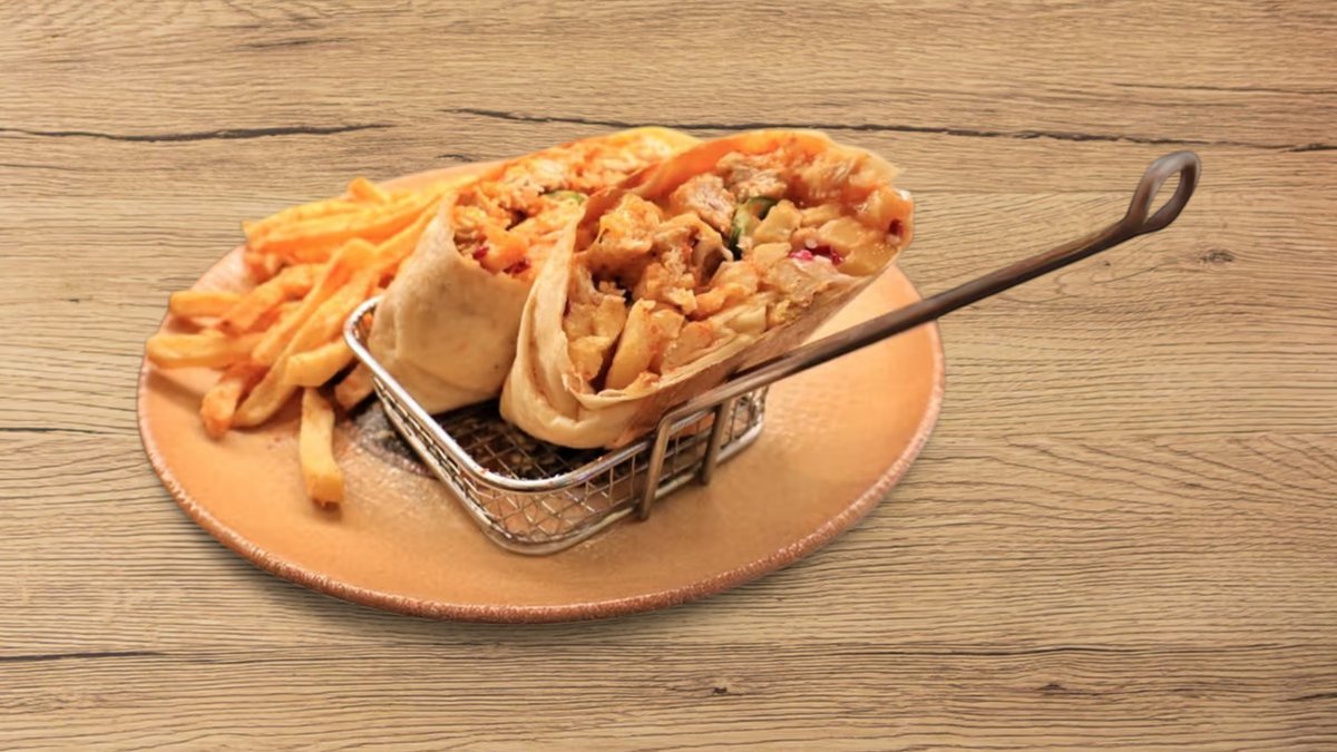 Τορτίγια XL με ψιλοκομμένο fried chicken, διπλό τσένταρ, πατάτες, σαλάτα coleslaw, χειροποίητες πικλες, sauce μουστάρδας & sweet chilli sauce. Συνοδεύεται από πατάτες και ντιπ χειροποίητη sauce μουστάρδας