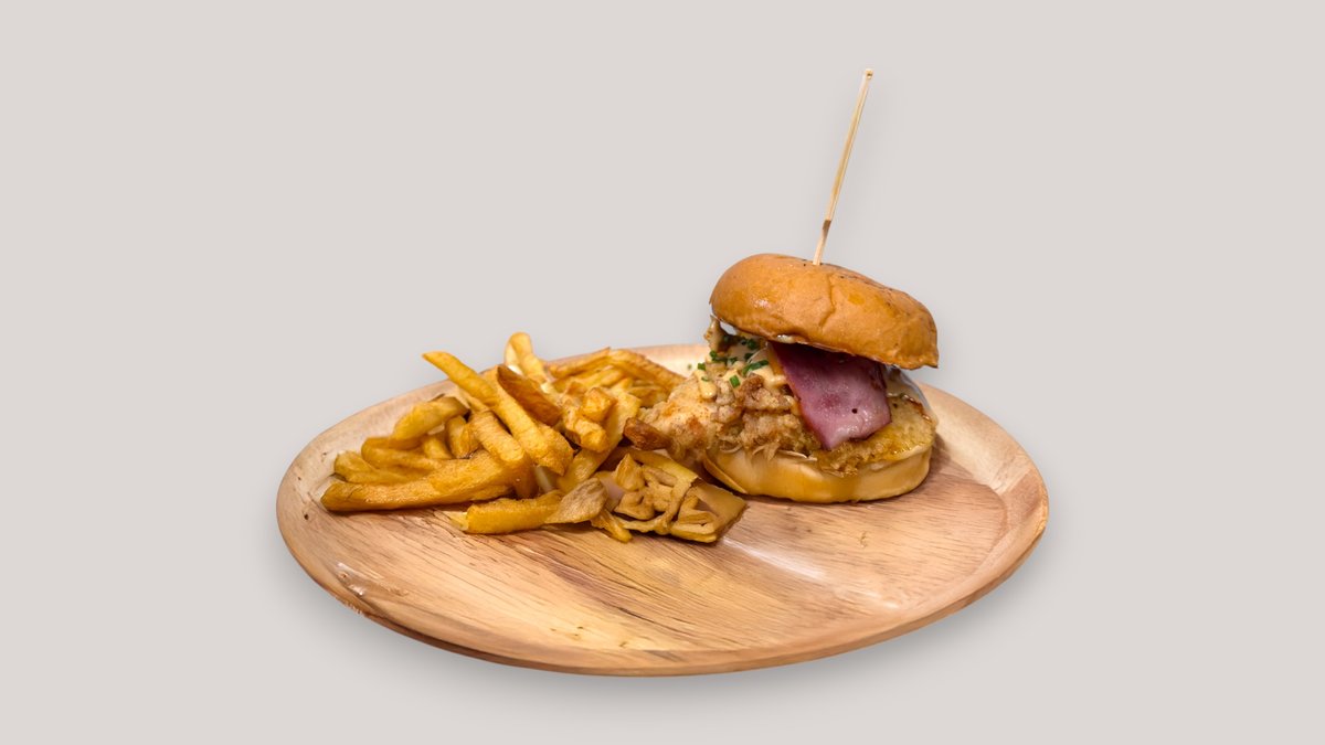 Με brioche roll με χειροποίητο τηγανιτό φιλέτο κοτόπουλο, διπλό cheddar, crispy onion, shred iceberg, aioli και bbq sauce. Συνοδεύεται από πατάτες τηγανιτές