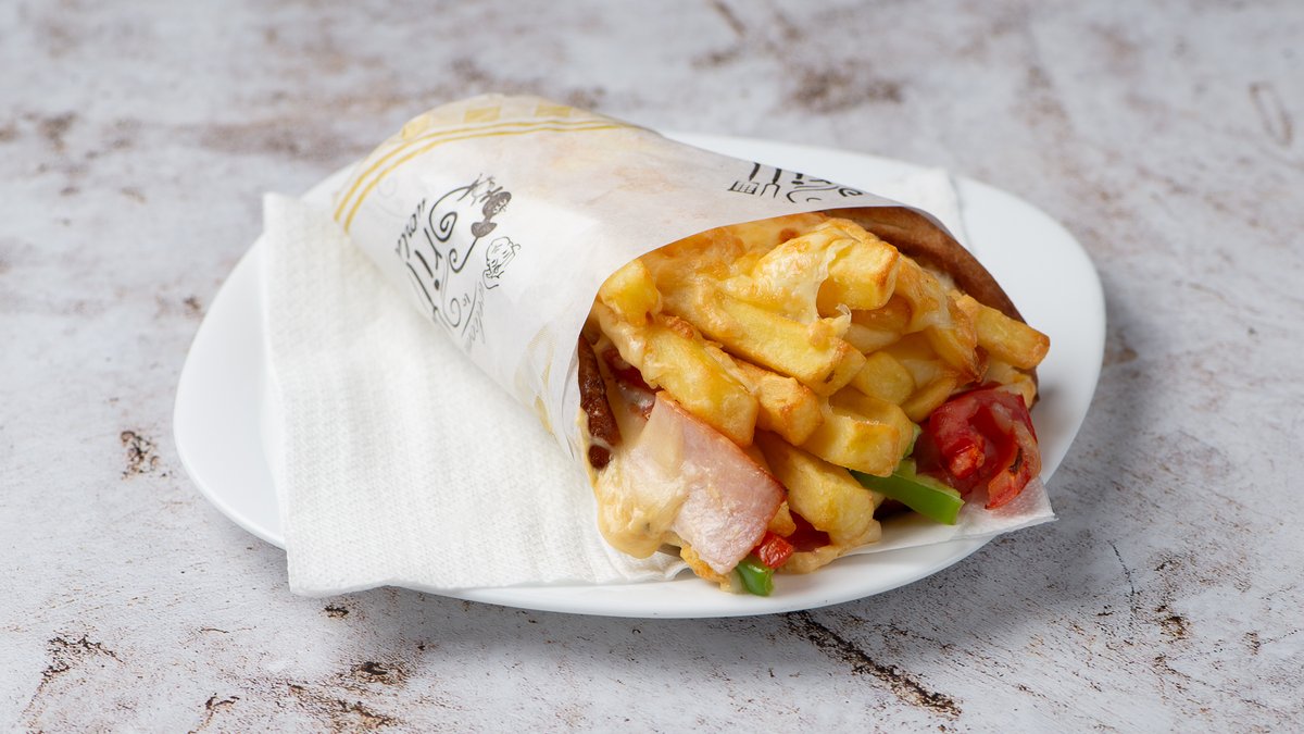 Με καλαμαράκι, τυρί σόγιας, ντομάτα, μαρούλι και ketchup. Συνοδεύεται από πατάτες τηγανητές