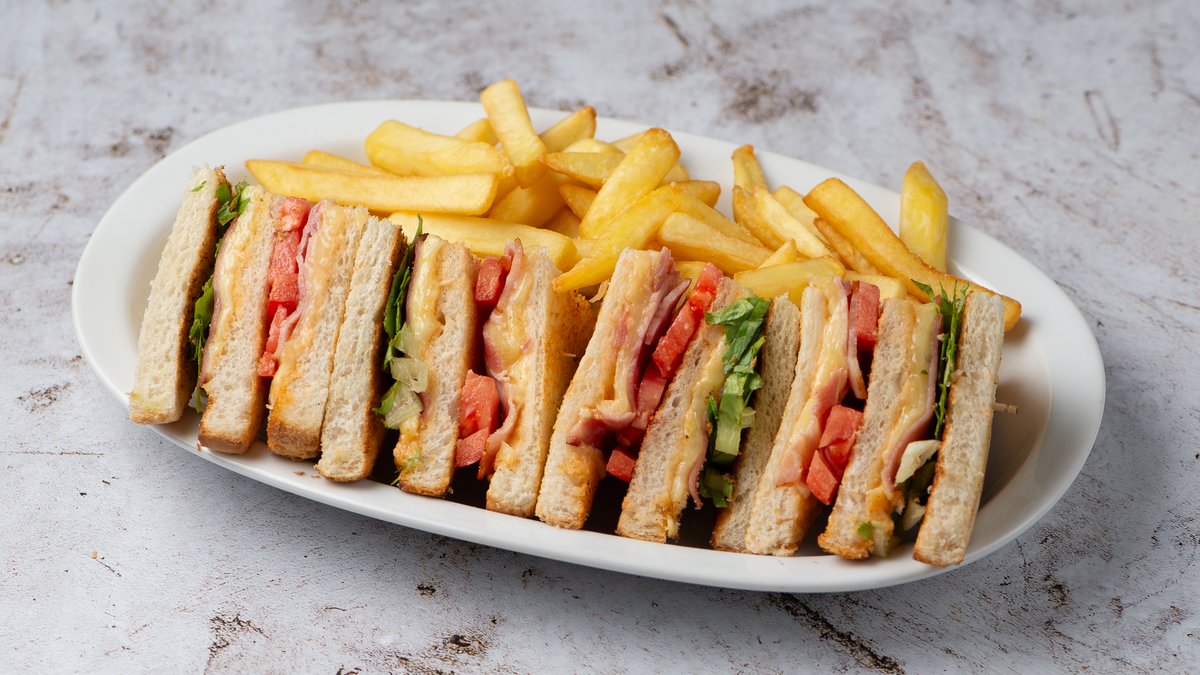 Με σάλτσα ντομάτας, mix τυριών (gouda, mozzarella και edam), ζαμπόν, μπέικον, αυγό βραστό και ντομάτα