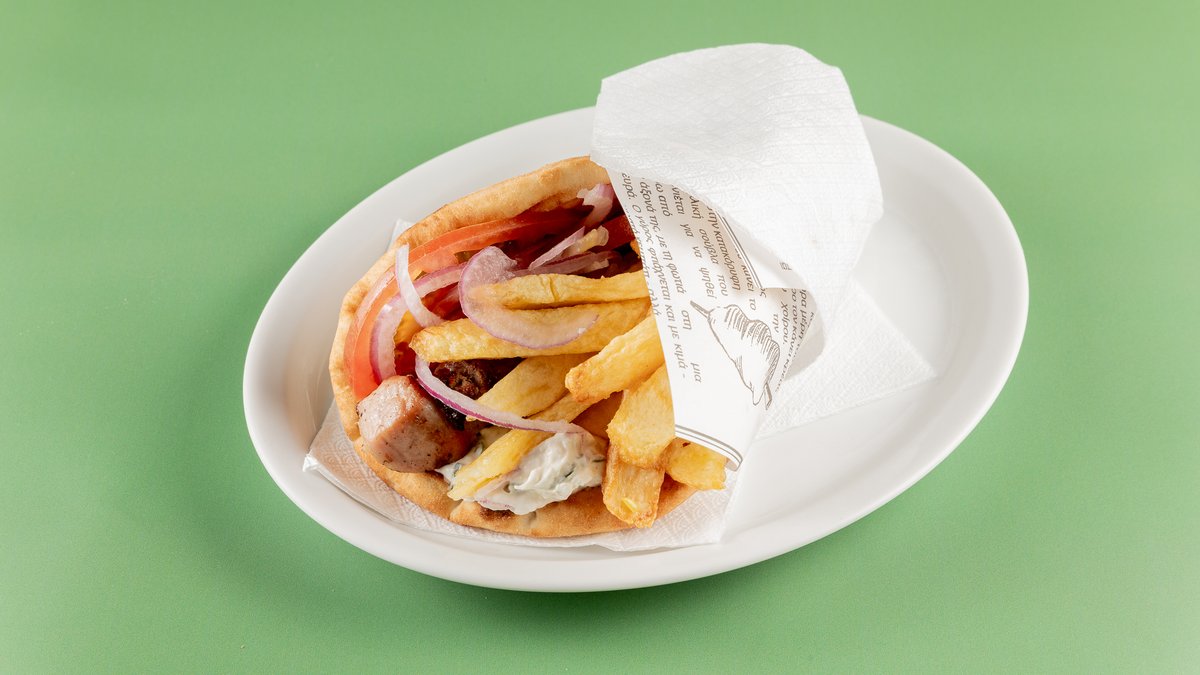 Με γύρο κοτόπουλο. Επίλεξε τα υλικά που επιθυμείς. Συνοδεύεται από πατάτες τηγανητές