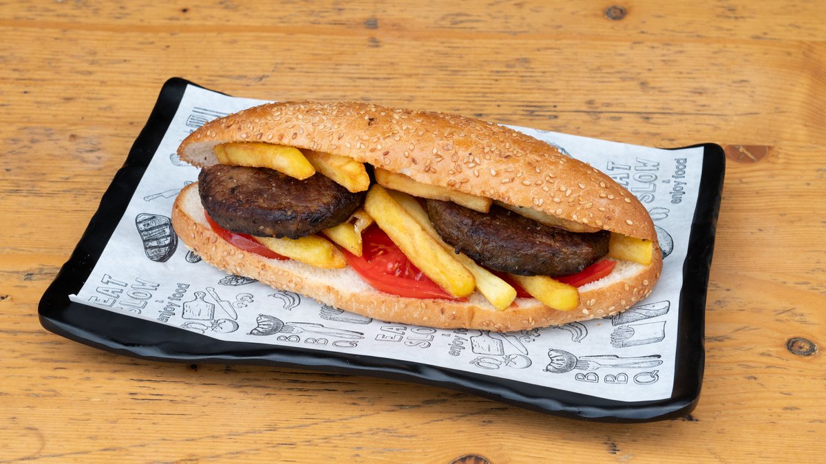 Με γύρο κοτόπουλο, μπέικον, gouda, ντομάτα, μαρούλι και ουγγαρέζα. Σερβίρεται με πατάτες τηγανητές