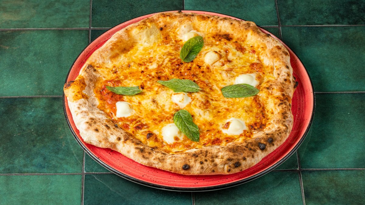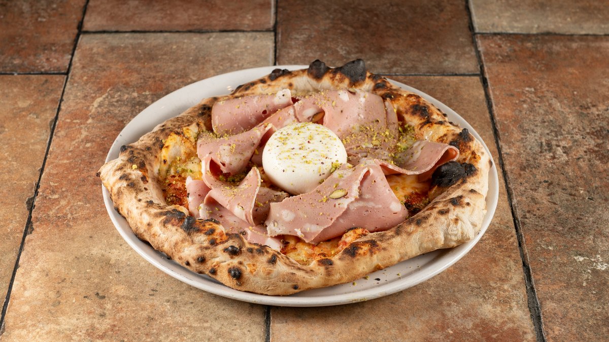Με σάλτσα ντομάτας, ολόκληρο κομμάτι burrata, μορταδέλα και τριμμένο φιστίκι