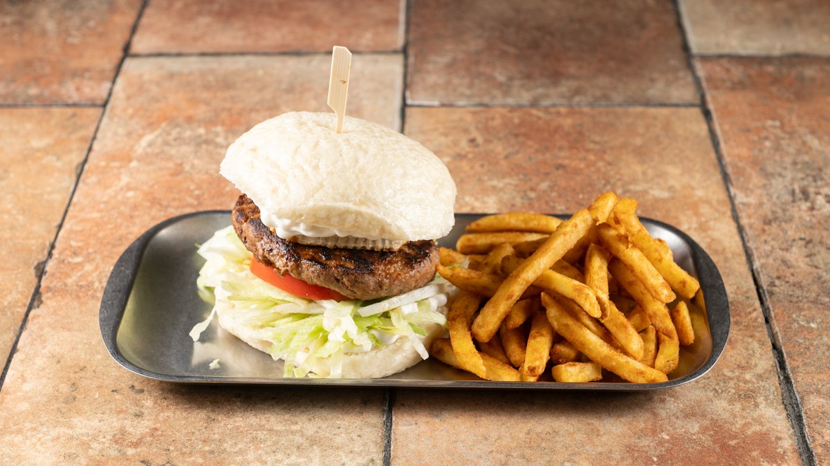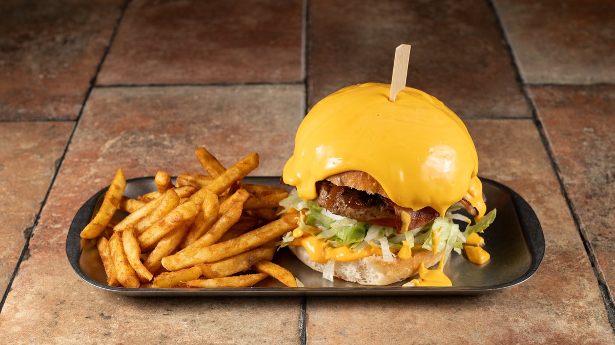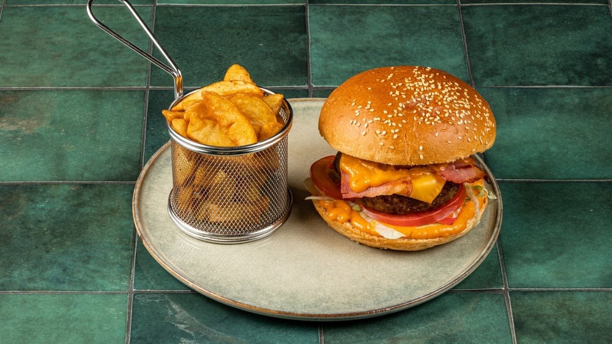 Με μπιφτέκι μοσχαρίσιο, μπέικον, cheddar, ντομάτα, iceberg, αυγό, γλυκό dressing μουστάρδας και ketchup, σερβίρεται πατάτες country