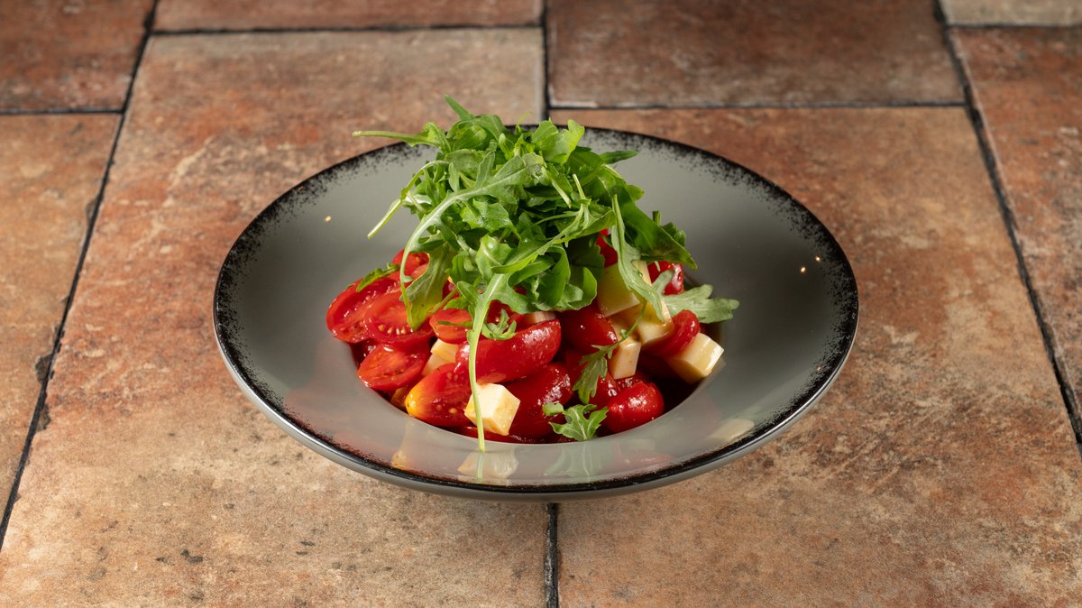 Σαλάτα με ρόκα, ντοματίνια, φρέσκια μοτσαρέλα, βασιλικό, καπνιστό σολομό και σάλτσα ελαιόλαδου