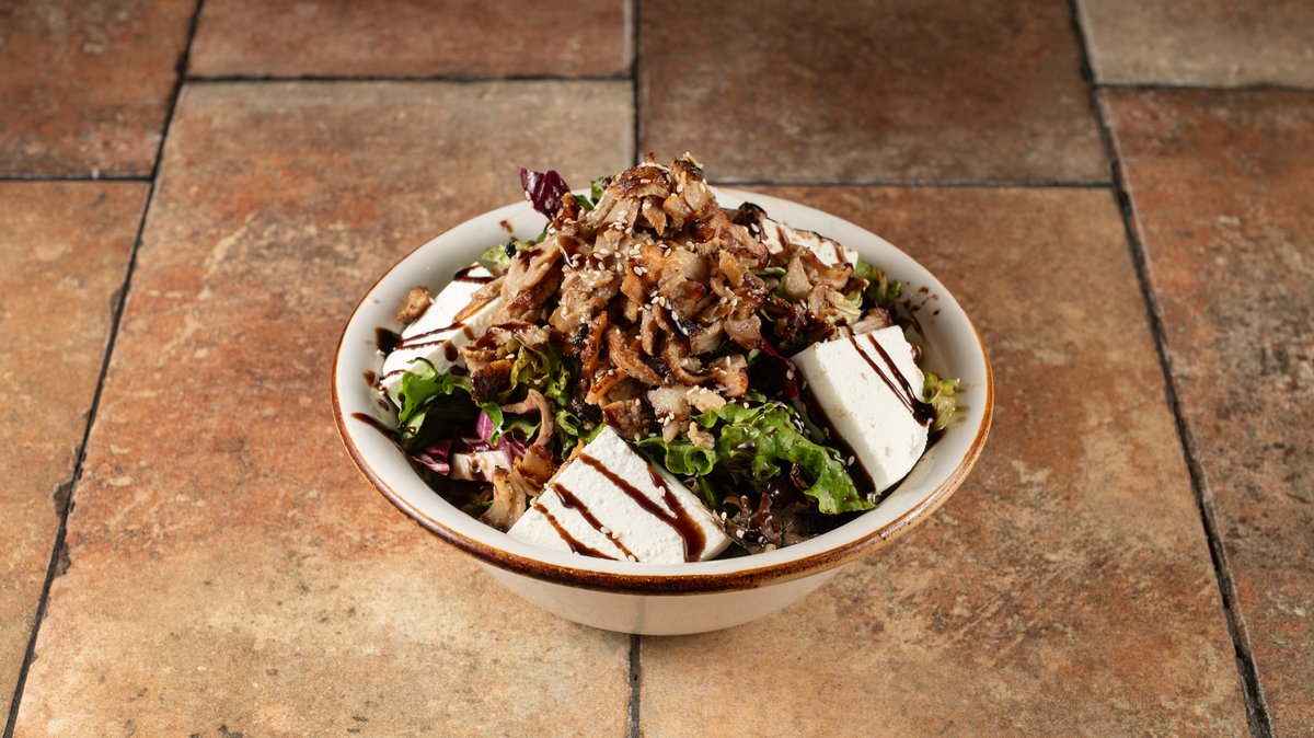 Σαλάτα με ανάμεικτα πράσινα λαχανικά, γύρο χοιρινό, μανούρι, σουσάμι, κουκουνάρι και sauce οξύμελι