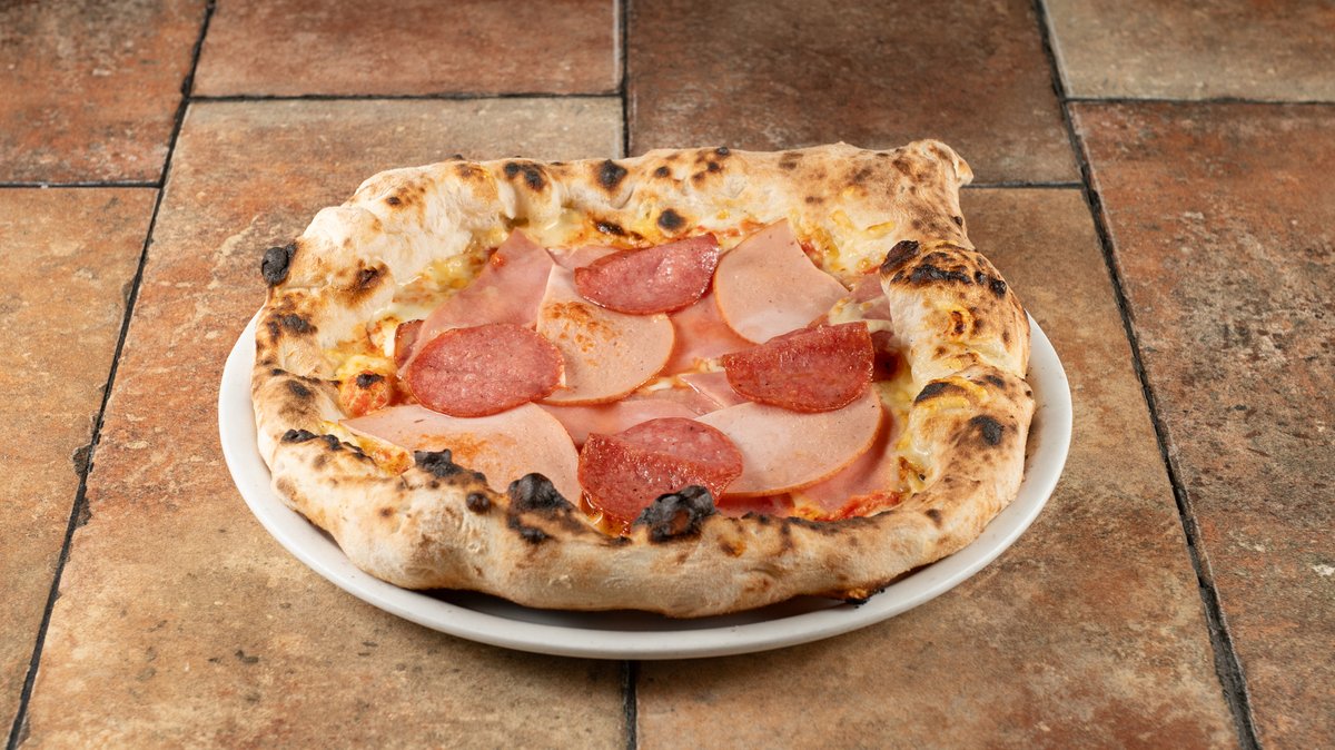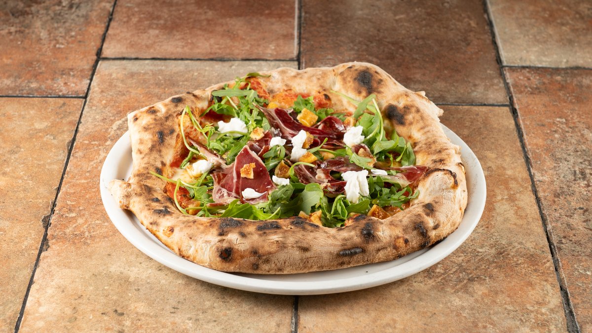 Με σάλτσα ντομάτας, gouda, μοτσαρέλα, προσούτο, ρόκα, ντοματίνι και βαλσάμικο