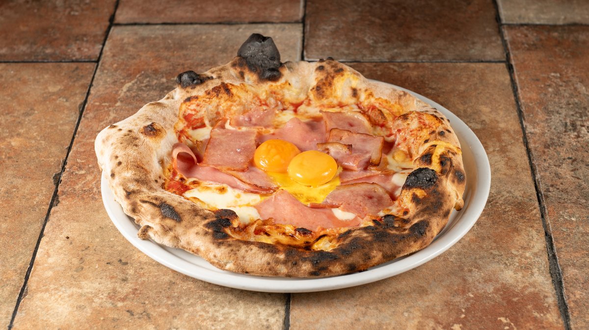 Με σάλτσα ντομάτας, μοτσαρέλα, ζαμπόν, μπέικον και 2 αυγά