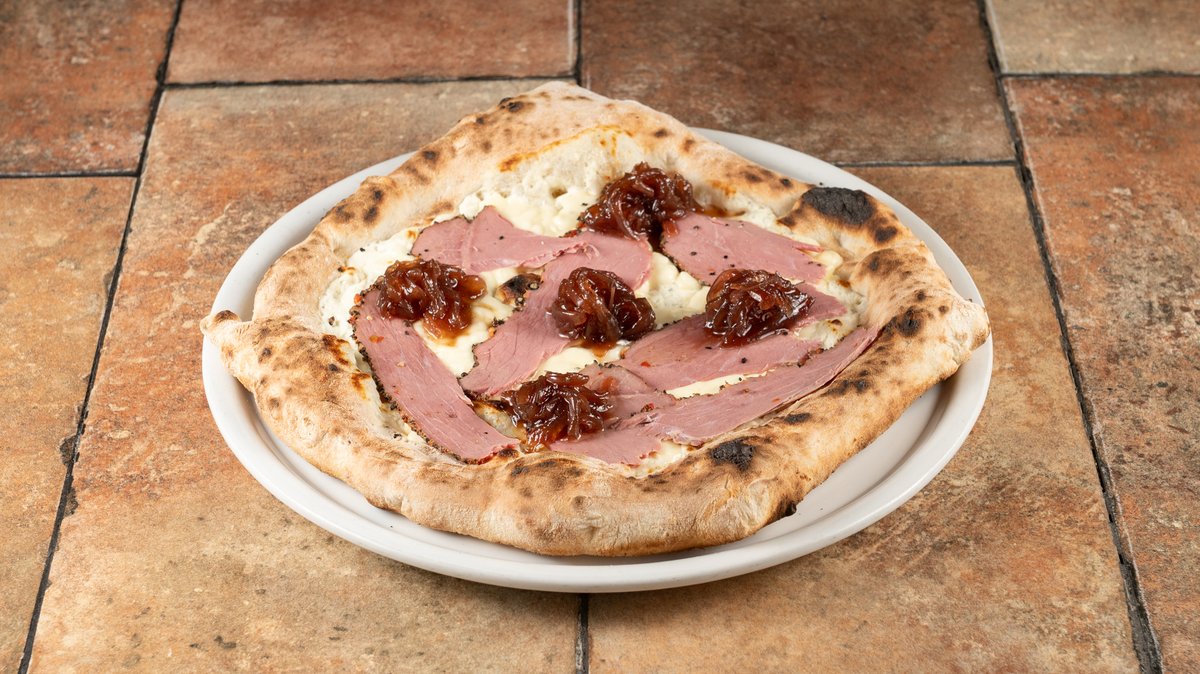 με κρέμα τυρί, μοτσαρέλα, παστράμι και καραμελωμένο κρεμμύδι