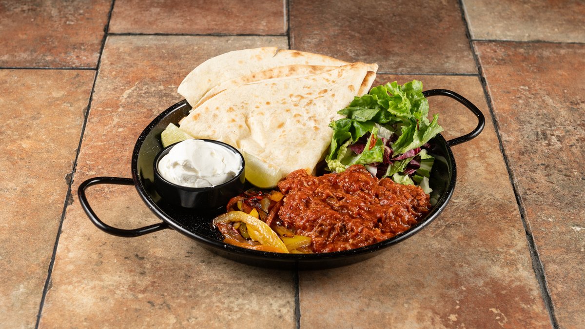 Κομματάκια κοτόπουλο τσιγαρισμένα με πιπεριές, σερβίρεται με πίτες τορτίγιας,φρέσκο κόλιανδρο,καυτερή κόκκινη σάλτσα και απαλή σως γιαουρτιού